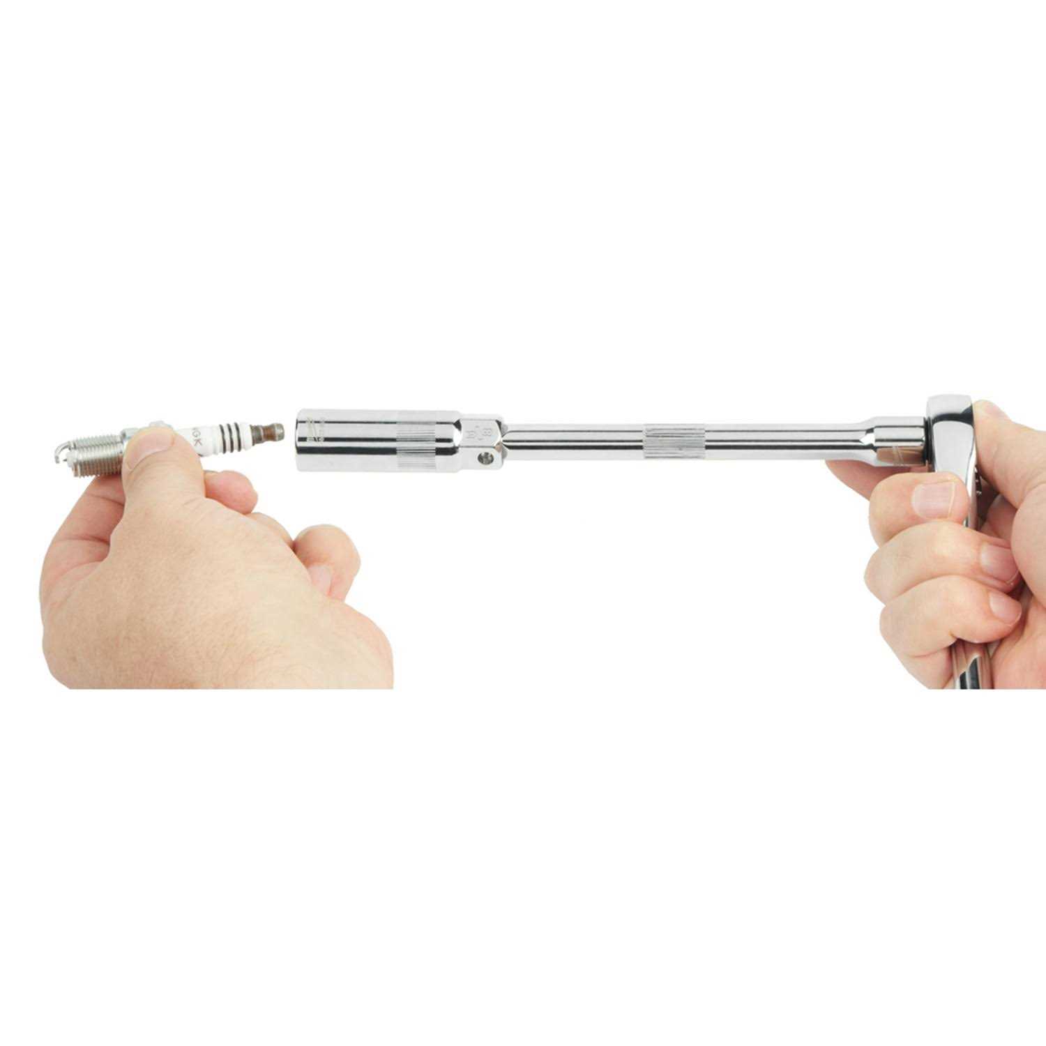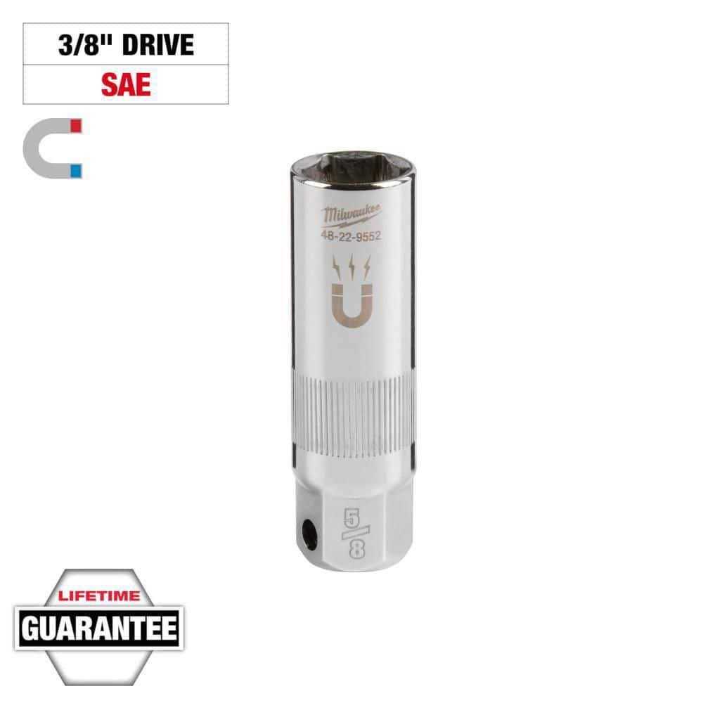 The MILWAUKEE 3/8″ Drive 5/8″ 6-Point Magnetic Spark Plug Socket features an amplified rare earth magnetic retainer that balances a secure fit with smooth removal of the spark plug from the socket. A precision knurling on the outside of the socket allows for better control when hand tightening or loosening. Both the socket and retainer withstand harsh chemicals commonly found in the garage. Stamped size markings make it easy to identify the size of the socket. The external hex at the base of the socket fits an 11/16” wrench for added control. Milwaukee Spark Plug Sockets are backed with a Lifetime Guarantee.