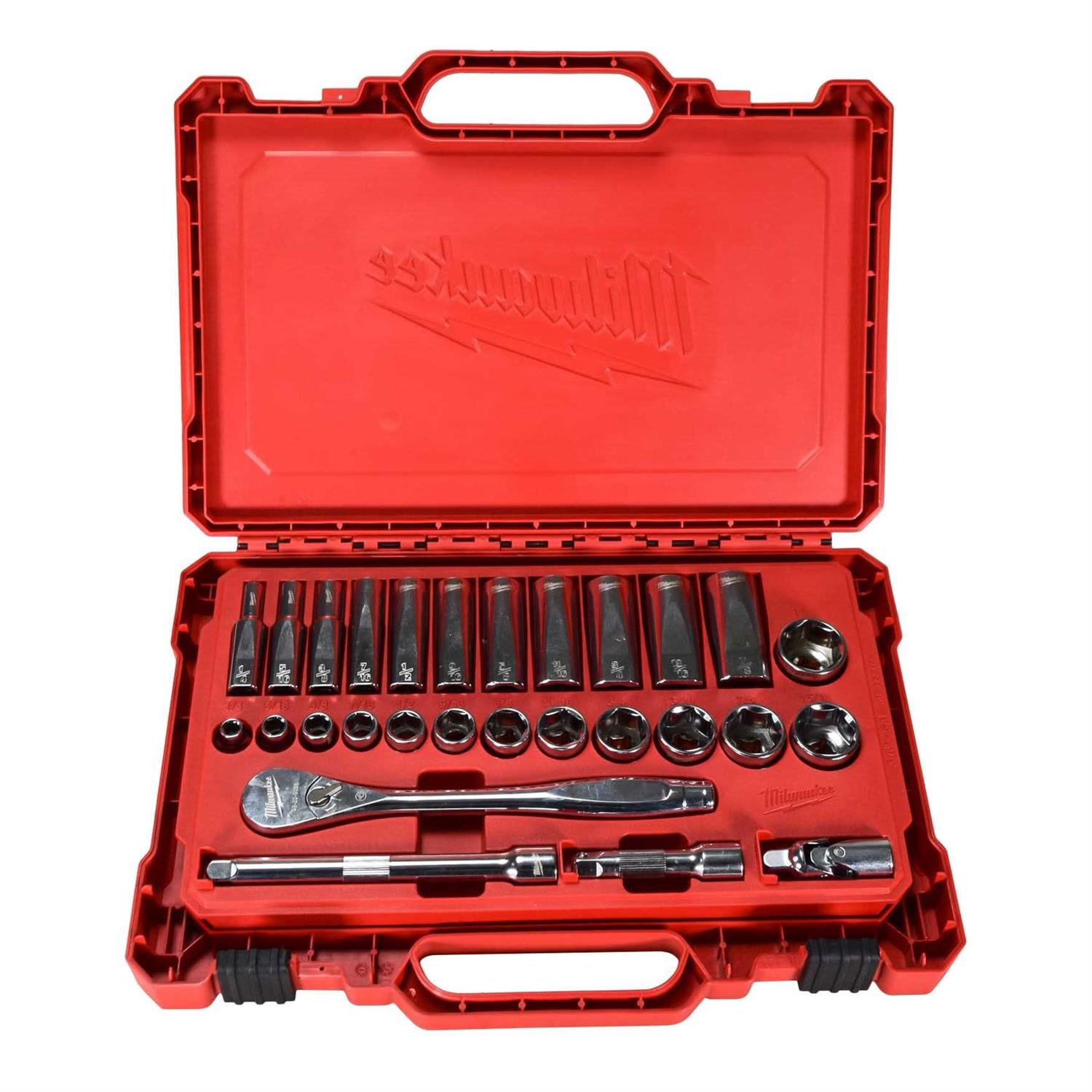Our MILWAUKEE SAE 28 piece 3/8″ drive Ratchet & Socket set is designed from the ground up, offering our users the Most Versatile Sockets that are Anti-Roll and Wrench-Ready. Its innovative FOUR FLAT Sides feature an anti-roll and wrench-ready design. The 90 tooth ratchet tool offers 4? of arc swing and a slim profile design, allowing you to work in tighter and more confined spaces, be it under the hood of a car or in the middle of a remodel. The ratchet and socket kit comes with a removable inner tray which is perfectly designed to be stored long-term in a steel storage chest. All of our sockets are stamped with SAE measurements on the flat side for easy-to-read visibility. It also comes with a durable carrying case for ultimate portability. The set comes with accessories included so that our users can get every job done, both in the garage and on the jobsite. Our ratchet and socket set is backed by our Lifetime Guarantee.