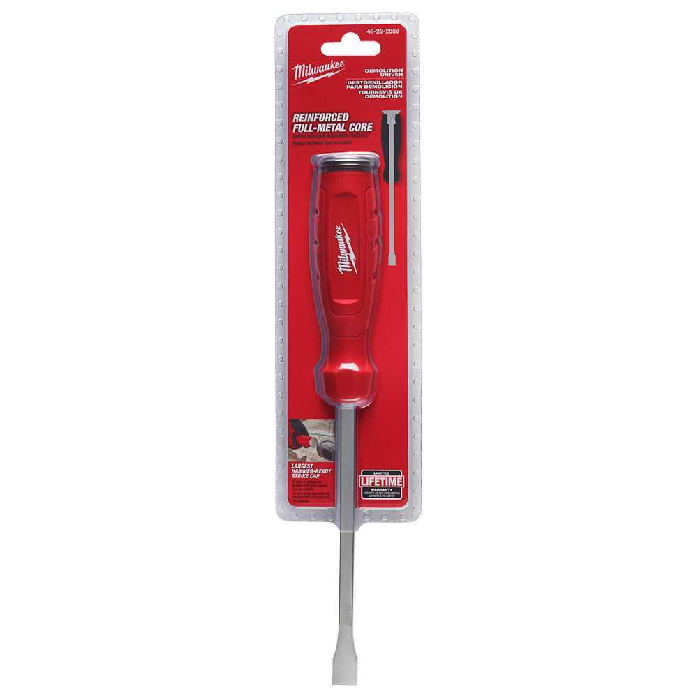 The Milwaukee Demolition Driver (48-22-2859) features a reinforced full-metal core designed to give you maximum job site toughness and durability. The hammer-ready steel strike cap and 5/16″ prying and chiseling tip are the largest in the industry and are designed to withstand the most aggressive demolition screwdriver applications. The forged steel shank offers 2X longer life and features a wrench-ready square design to deliver additional leverage.