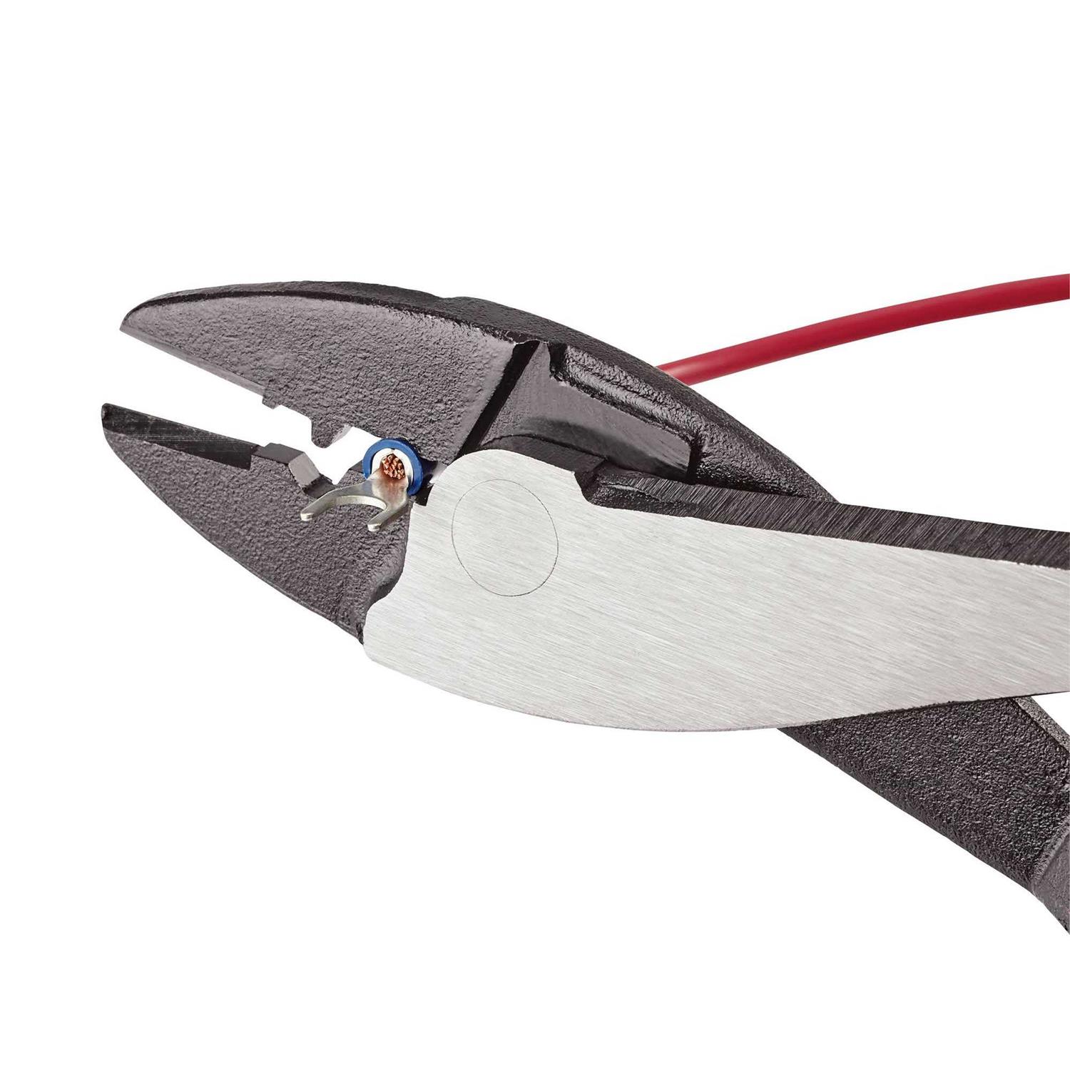 Crimp, cut, grip and smooth out wires and pipes using the Milwaukee Crimping Pliers. For your convenience, the lineman pliers crimp both insulated and non-insulated wires with up to two times as much crimping force as other plier brands. The Milwaukee crimping pliers have a forged design for durability and a longer lifespan and are resistant to rust and corrosion. To help smooth out any rough edges on your metal pipes before installation, this tool has a built-in reaming head. There’s also a built-in wire cutter for snipping 8-28AWG wire. The handle grips on the Milwaukee wire cutting pliers are comfortable and won’t dig into or hurt your hands even with repeated use. For longer lasting use, the handle grips have a non-peel design.