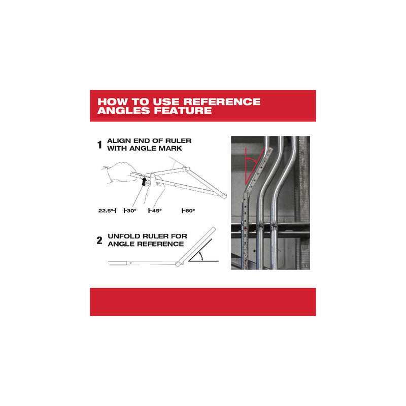 The Milwaukee 48-22-3802 is a composite engineer’s folding rule designed to get precise measurements for long and angled runs. It is also ideal for transferring scale measurements accurately. The embedded joints of this folding rule lock in place at 90- and 180-degrees for added stability and utility as it stays rigid even for triangulated measuring. It lays flat against measuring surfaces for ease of use. It is made of composite laminate materials for durability and wearability. This folding rule has recessed heat-stamped markings that won’t wear, allowing users to quickly determine common conduit bend angles. It has dimensions of 1.375″ (width) x 9.25″ (length) x 0.625″ (height) and weighs 0.275 lbs.Since 1924, Milwaukee is dedicated to developing new-to-world innovations, powering the most versatile and the most durable tools on the job site. They are focused on improving productivity for professionals in the trades, offering an unwavering commitment while focusing on providing trade-specific solutions that fully deliver maximum portability and productivity for the professional user.