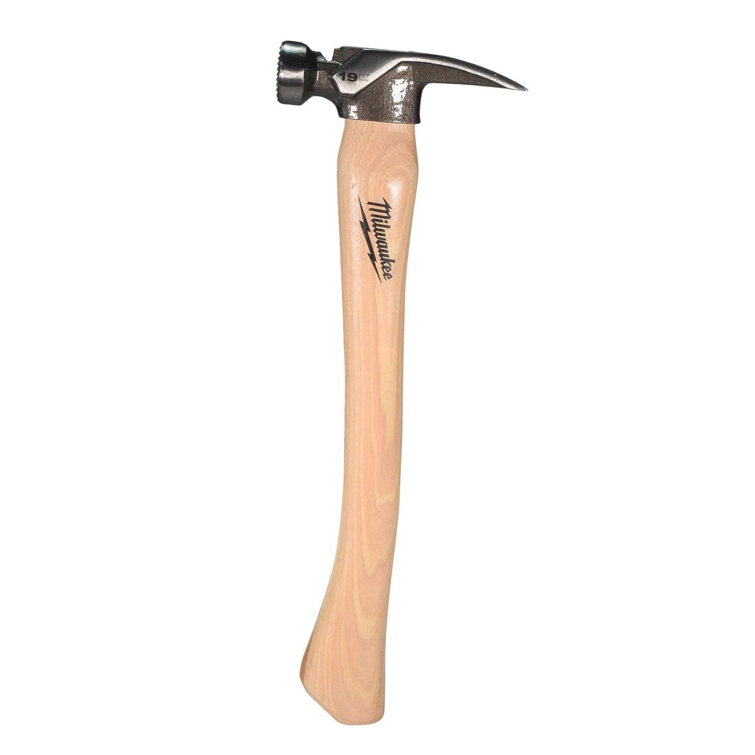The Milwaukee 48-22-9419 19oz Milled Face Hickory Handle Framing Hammer is designed for our carpenters and craftspeople with a precision balanced design and naturally shock-absorbing American Hickory handle to give you the Best Driving Performance. The wood handle framing hammer has a magnetic nail set in the metal head to help you work more productively. It also features an ax-style curved handle that gives you a better, more comfortable grip on the hammer as well as an anti-ring claw.