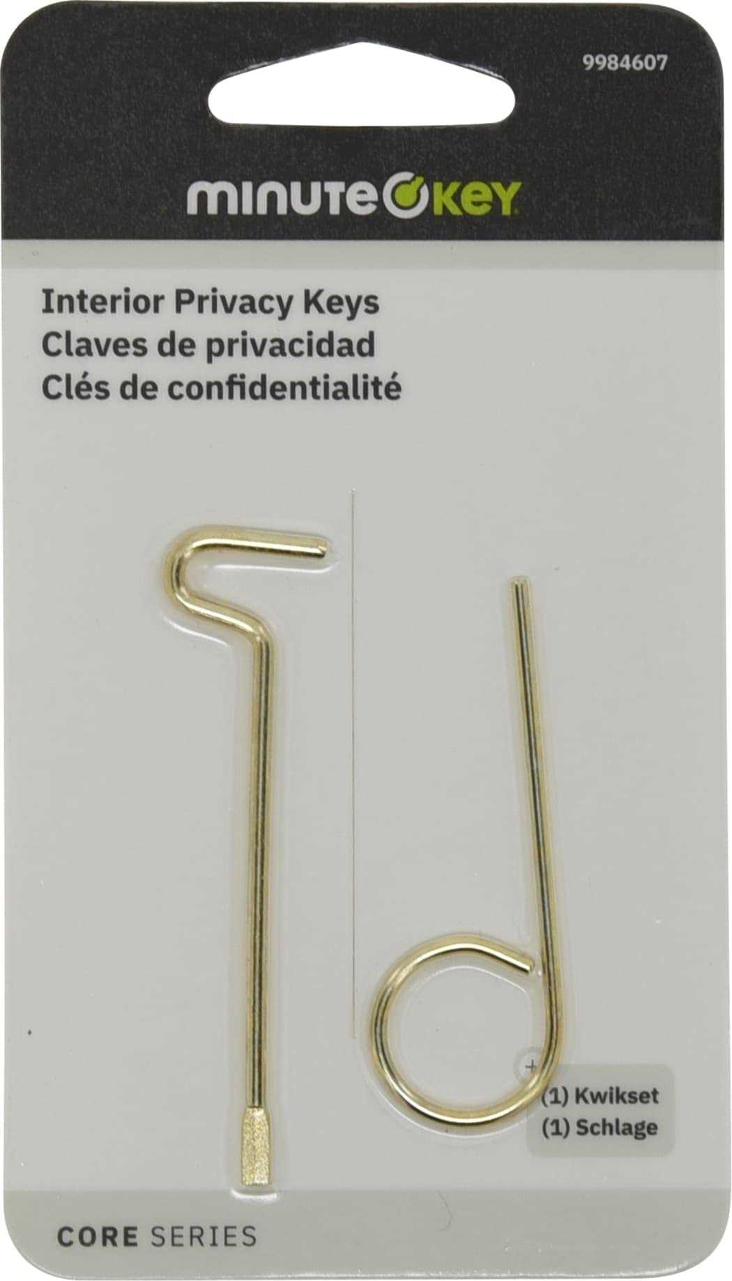Includes both Kwikset and Schlage keys. Insert key into the center hole of the door knob and turn or push to unlock. Brass finish.