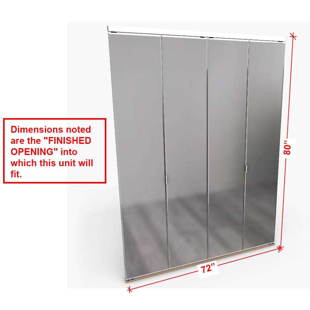 Frame-less style polished (plain) edge mirror creates a contemporary look. Solid backing for more sturdy feel and more impact resistant for peace of mind. White top track and trim and optional oak bottom saddle is easy to install. Bi-fold is for a 72 in. wide finished opening and is made of four 17-3/4 in. panels. Bi-fold height is adjustable from 79-1/4 in. x 80-1/2 in. for 80 in. tall doors.