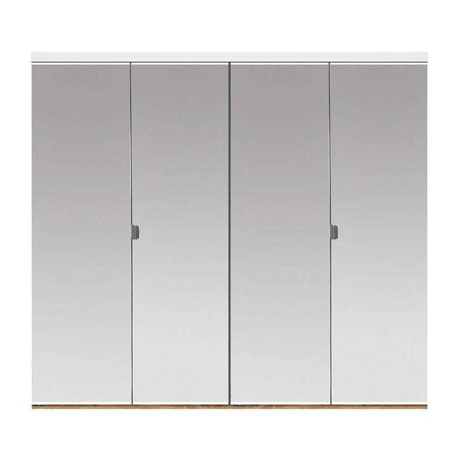 Frame-less style beveled edge mirror creates an upscale look. Solid backing for more sturdy feel and more impact resistant for peace of mind. White top track and trim and optional oak bottom saddle is easy to install. Bi-fold is for a 60 in. wide finished opening and is made of four 14-3/4 in. panels. Bi-fold height is adjustable from 79-1/4 in. x 80-1/2 in. for 80 in. tall doors.