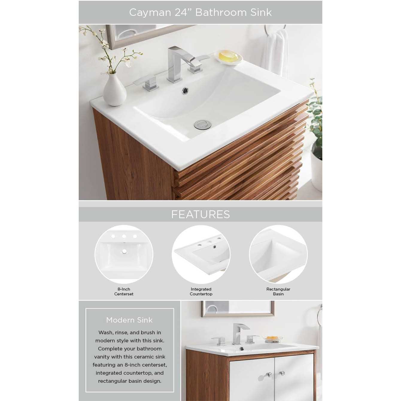 Wash, rinse, and brush in modern style with the Cayman 24 inch Sink. Complete your bathroom vanity with this ceramic sink featuring an 8-inch centerset, narrow integrated countertop, and squared basin design.