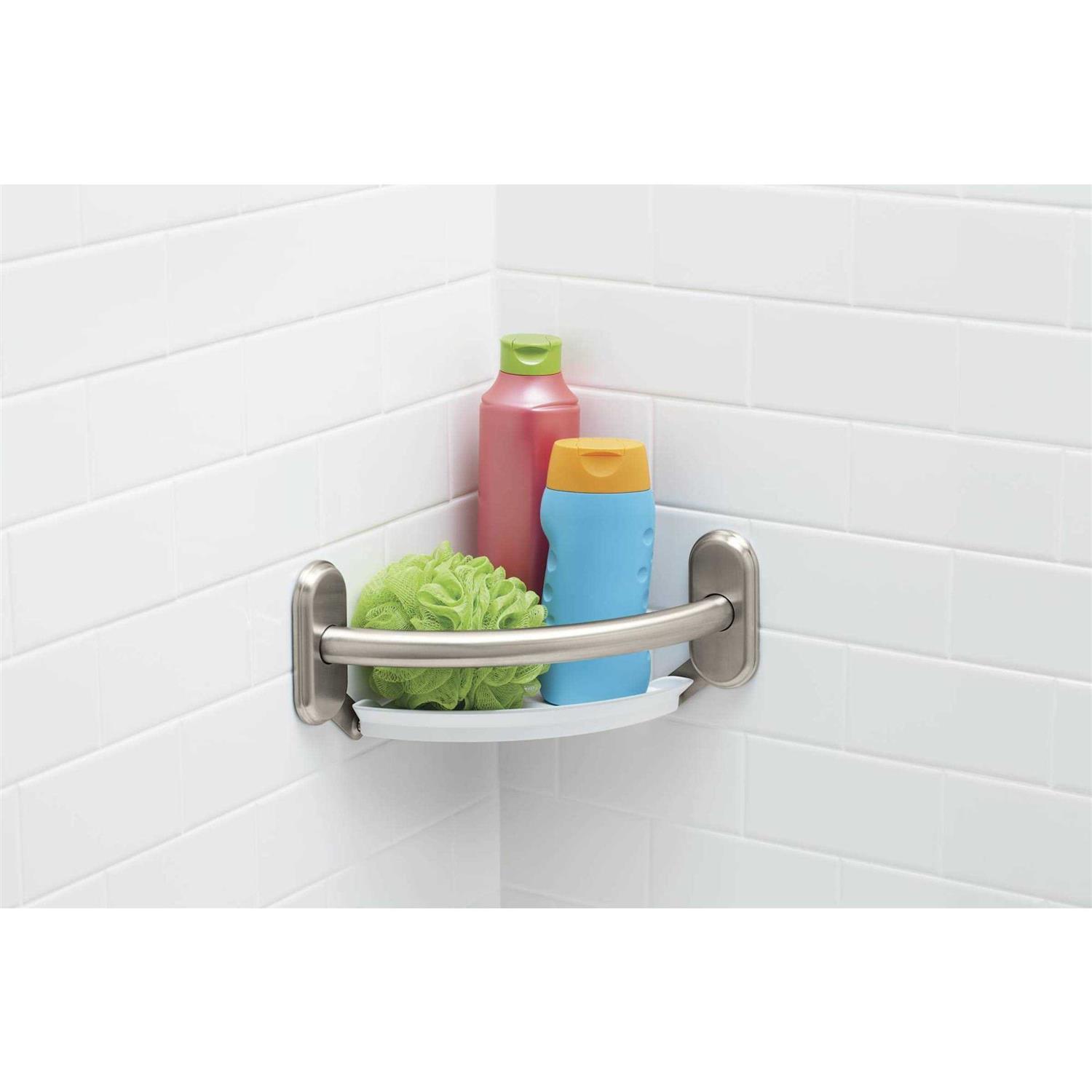 Stay steady in the shower and easily access soap, shampoo, and other bath products with the Moen Grab Bar with Corner Shelf. This grab bar supports up to 250 pounds and provides a reliable handhold for bathtubs and showers. The curved bars streamlined design includes an integrated corner shelf with removable white tray. It also features a SecureMount design for easy, secure installation at any angle. Made from durable stainless steel, this 1-inch diameter shower grab bar with shelf features a warm brushed nickel finish that coordinates with almost any bath decor.
