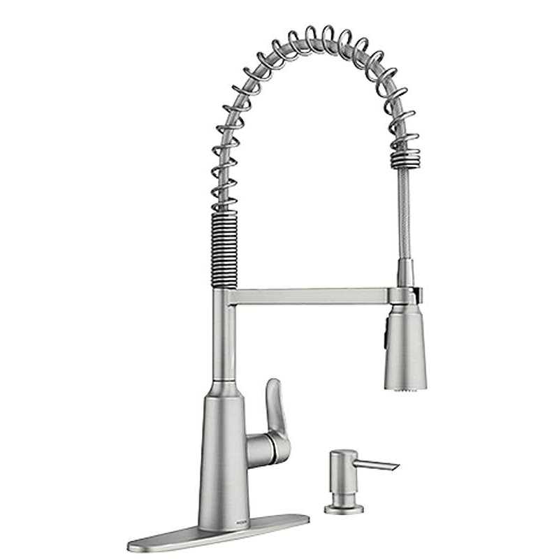 The Edwyn pulldown kitchen faucet offers a simplistic look with sleek lines and a spring spout that brings a unique, modern feel to any kitchen. Equipped with Moens Power Clean spray technology, Edwyn provides 50 percent more spray power versus most Moen pulldown and pullout faucets without the technology. The Reflex system ensures smooth operation and secure docking of the spray wand. Its available in Moens exclusive Spot Resist Stainless finish, which resists fingerprints and water spots to maintain the fixtures brilliance. A matching soap dispenser provides fully coordinated convenience.
