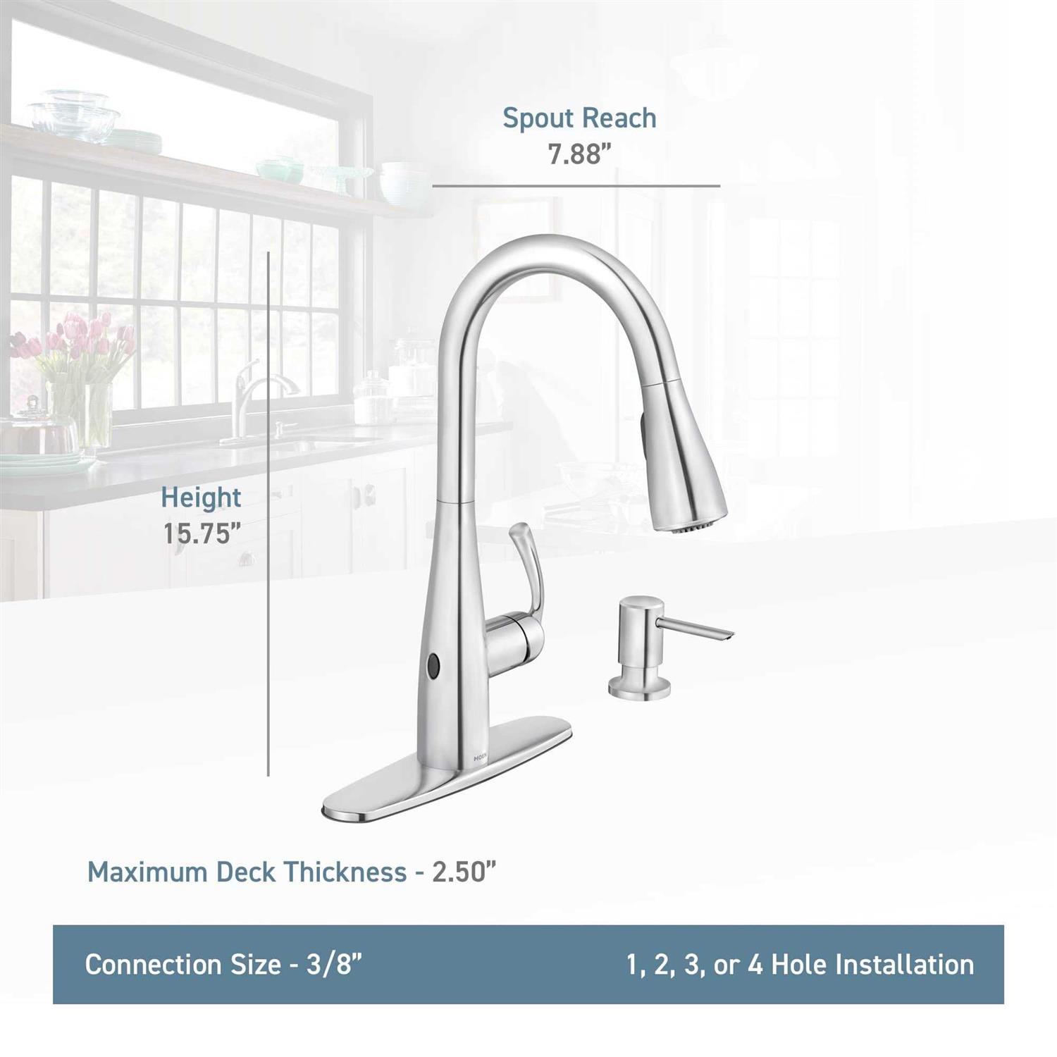 Wave hello to the next generation of kitchen convenience. Our Essie pulldown kitchen faucet with MotionSense wave features touchless activation for hands-free accessibility. With a simple wave of a hand, you can clean grubby hands and fill heavy pots without turning on the faucet. Its graceful curved silhouette also features a pulldown faucet equipped with power clean spray to clean with more force in less time. Choose from 3 finishes options, including chrome, mediterranean bronze or MOEN’s exclusive spot resist stainless, to blend seamlessly into any homes style.