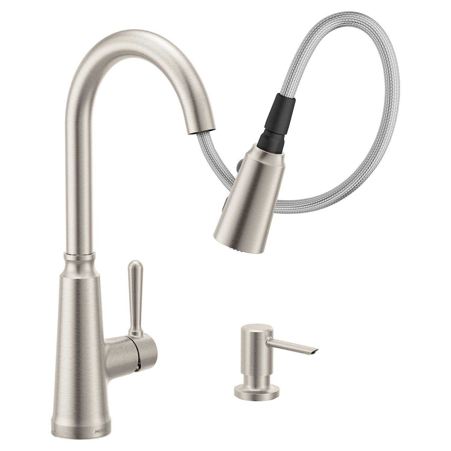 Moen Trew Spot Resist Stainless Single Handle Pulldown Kitchen Faucet From finishes that are guaranteed to last a lifetime to faucets that perfectly balance your water pressure, Moen sets the standard for exceptional beauty and reliable, innovative design. The Moen Trew Spot Resist Stainless Single Handle Pulldown Kitchen Faucet adds a perfectly balanced design to any kitchen. The pulldown spray head is equipped with the Reflex docking system for smooth operation, easy movement and secure retraction. Two spray functions allow you to switch effortlessly between an aerated stream for everyday cleaning and a powerful rinse for heavy-duty applications. The powerful rinse is an exceptionally strong, concentrated spray, thanks to Power Clean technology. The single-lever design makes it easy to control water temperature and pressure, while the high-arc design makes it easy to wash and fill large pots and pans. An optional deck plate (escutcheon) is included. The Moen Trew Spot Resist Stainless Single Handle Pulldown Kitchen Faucet comes with a soap or lotion dispenser and can be installed in 1-, 2-, 3-, or 4-hole kitchen sink applications.