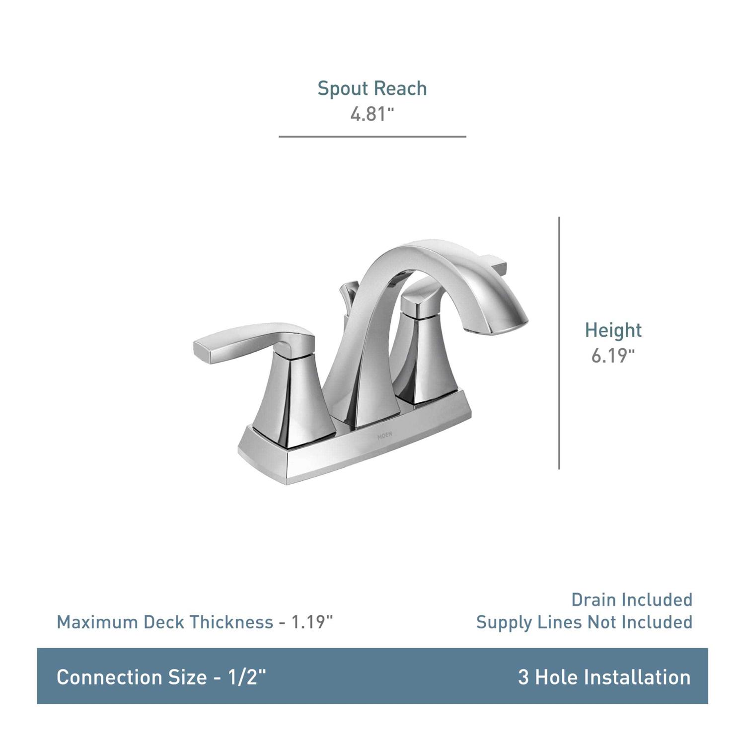 Make the Moen 6901 bathroom faucet the highlight of your bathroom. The metallic and highly reflective chrome finish is durable and can work on any lavatory accessory. As part of the Voss series, this gorgeous fixture with two lever handles is designed to be long-lasting and has an ergonomic design that ensures your lavatory experience.The high-arc spout of this faucet is 6-3/16″ high and provides more space in your bathroom sink. With an aerated water flow that is perfect for daily use, this faucet runs on a flow rate of 1.2 gallons per minute max (4.5 L/min), making it WaterSense certified. This lavatory faucet is designed to be installed using three holes including 4″ centerset with a 1/2″ IPS connector. The Moen 6901 has two lever handles that are ADA compliant, making it user-friendly, especially for those people with disabilities. This faucet includes a matching pop-up drain assembly.Don’t worry about leaks, drips, and finish defects.