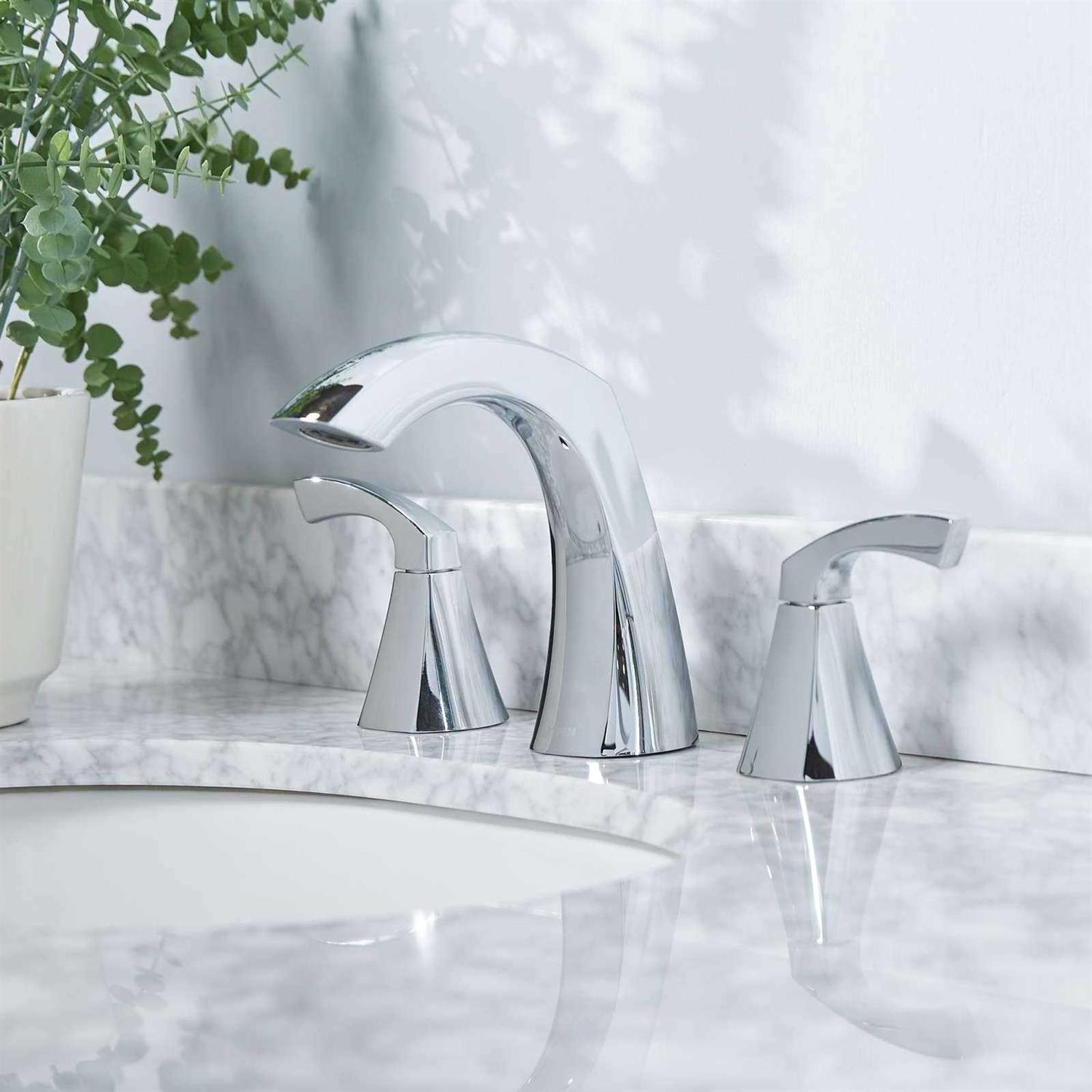 Accent your bathroom with the elegant geometry and ageless style of the Moen Lindor two handle widespread bathroom faucet. The traditionally-inspired faucet features a widespread installation design with lever handles that can be installed at any distance between 8 and 16 in to best fit your sink. Designed for a three-hole mount, the faucet features the Duralock Quick Connect System to take the hassle out of installation. The Lindor faucet provides an aerated stream of up to 1.2 gallons per minute and is designed to comply with WaterSense water conservation criteria and with Americans with Disabilities Act (ADA) specifications. A beautiful pairing of classic design and fashion-forward detailing, the Moen Lindor two-handle widespread bathroom faucet is a rich addition to any space.