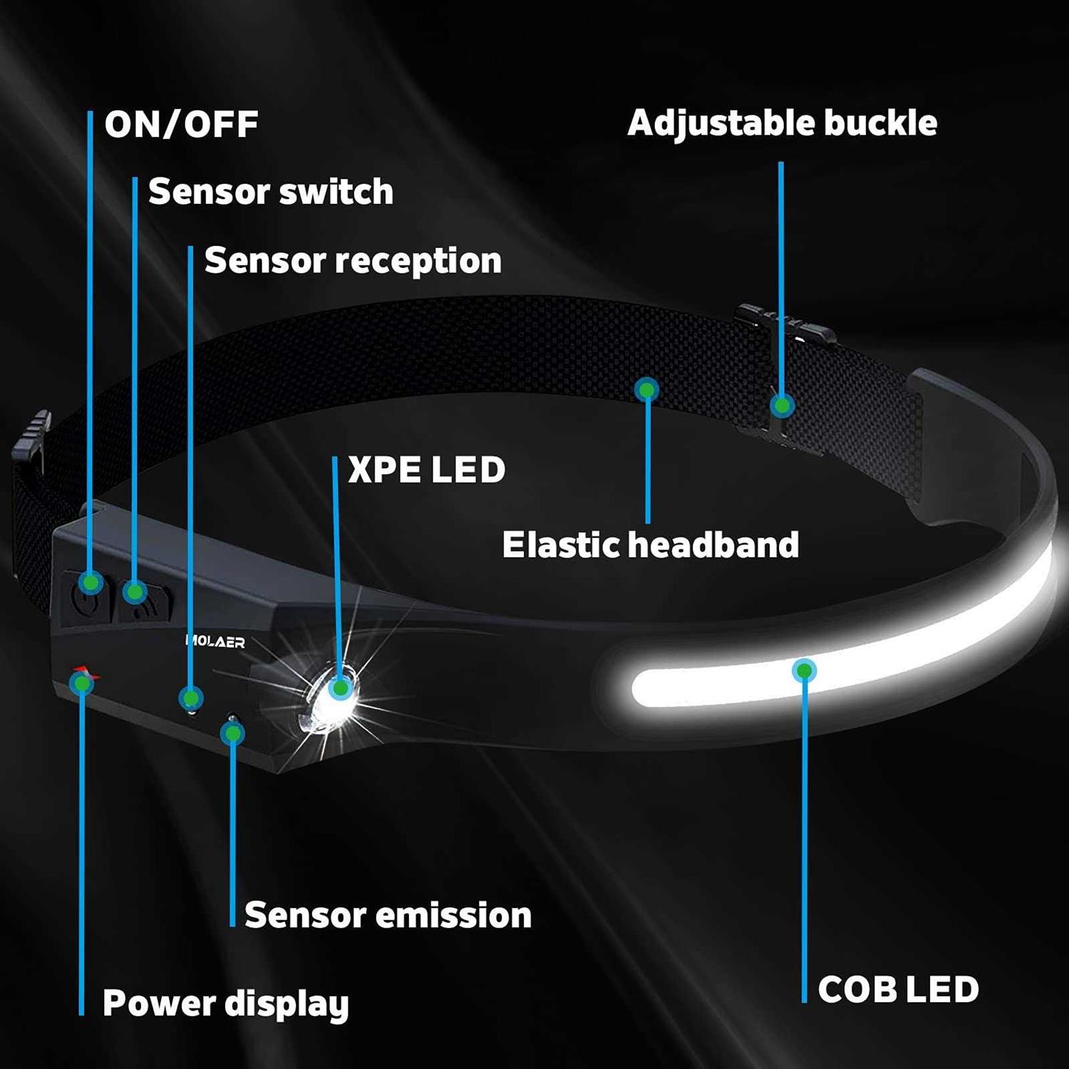 Molaer LED Headlamp Rechargeable Flashlight, 2-Pack 230° Wide Beam Headlight with Motion Sensor, Lightweight, Weatherproof, 2 Light Source Head Lamp