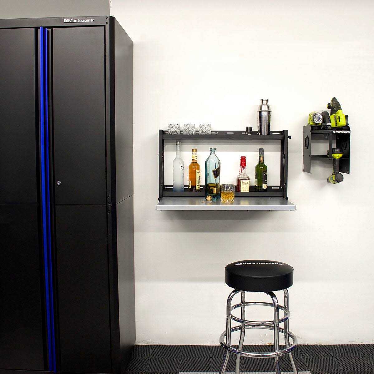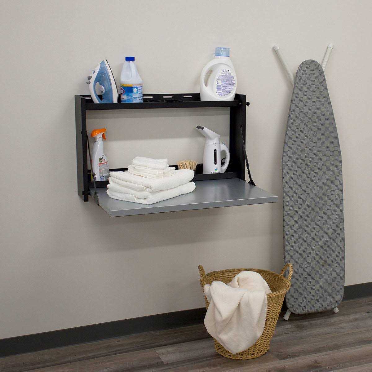 This versatile wall mounted workstation easily folds up and out of the way when not in use. It can function as a quick project station in the garage, a folding table in the laundry room, a garage or small kitchen bar, or even a child’s desk. It has an all steel body, and the worksurface is constructed with a galvanized steel top, a sturdy MDF core, and a reinforced steel bottom. It’s slim profile is only 6.8 inch deep when stowed away, and the worksurface is 18 inch x 30 inch when folded down. A pull pin releases the worksurface from the folded position and secures it when closed. Two mechanical arms hold the worksurface in place and can hold up to 200 lbs. Two steel shelves provide storage space for cans, bottles, and other supplies. It mounts to the wall 16 inch on center and includes hanging slots on the shelves to secure it to the wall. Fastening hardware is included. No assembly required.