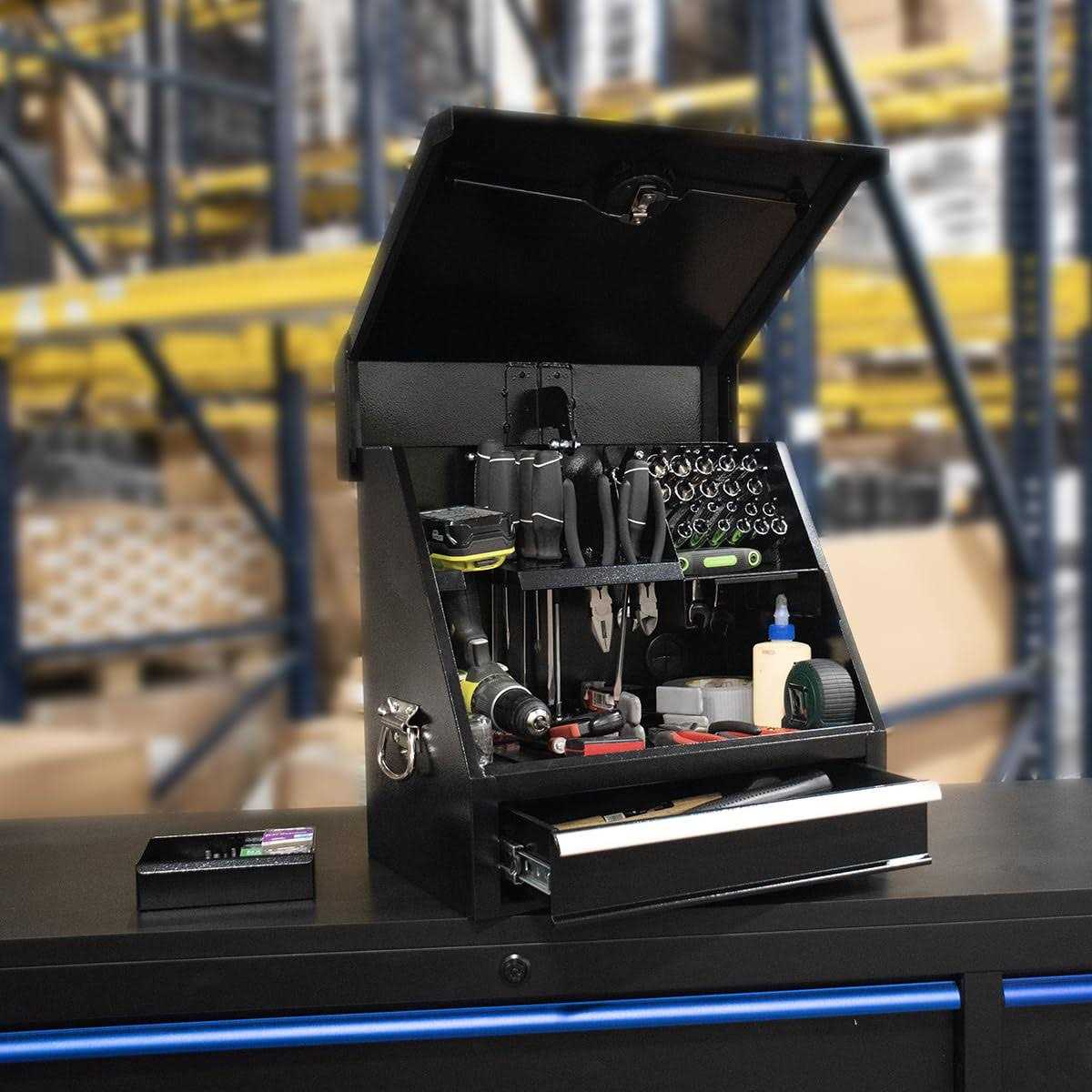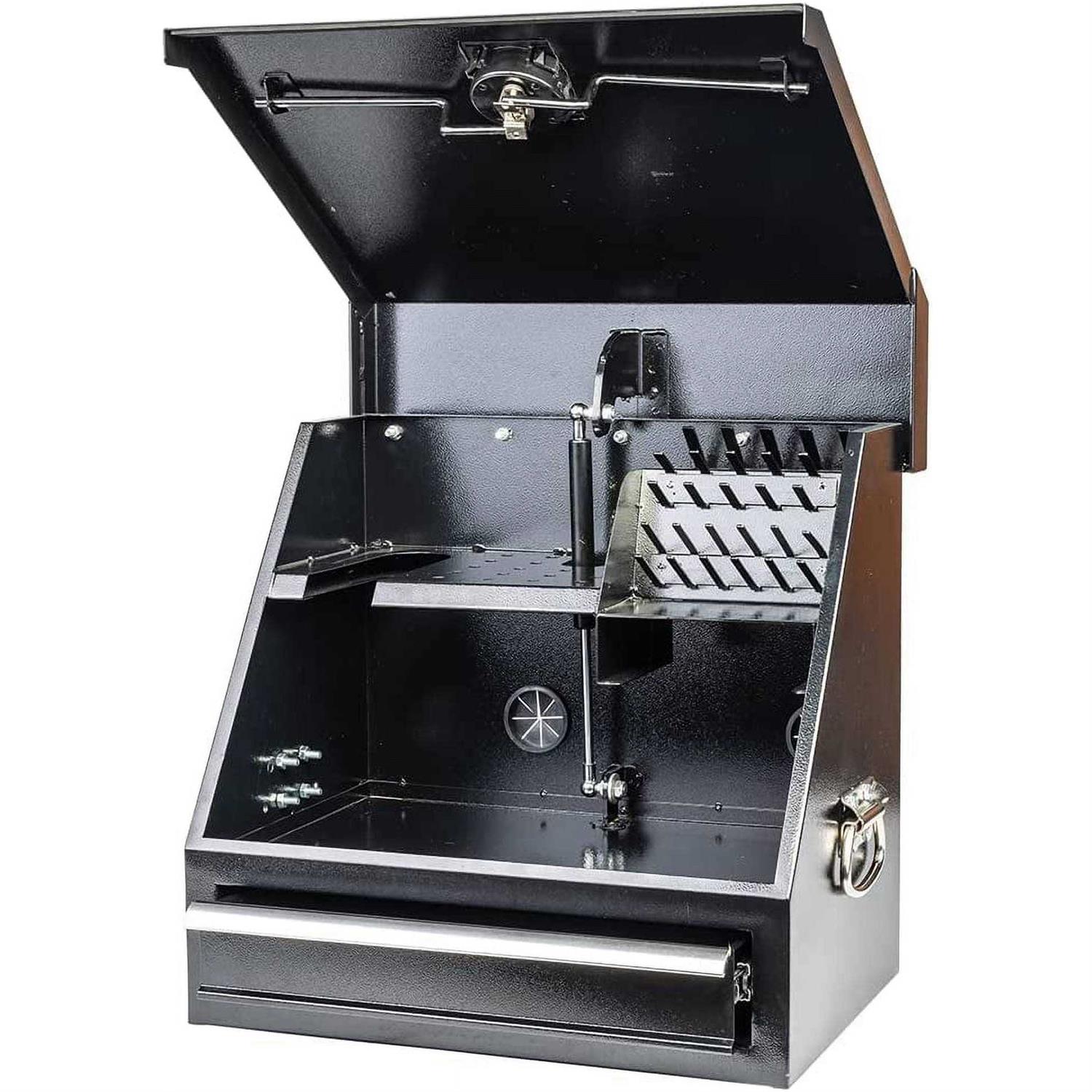 Steel Shopbox is designed to hold the 50 most popular tools and supplies owned by the average homeowner. Organize your hand and power tools, and see them all at a glance with the multi-tier design. When closed, the trademarked triangle lid design locks tools in position, creating protection, security and organization. The power tool holder and grommet hole are included for superior power management. The bottom drawer is perfect for storing larger tools.