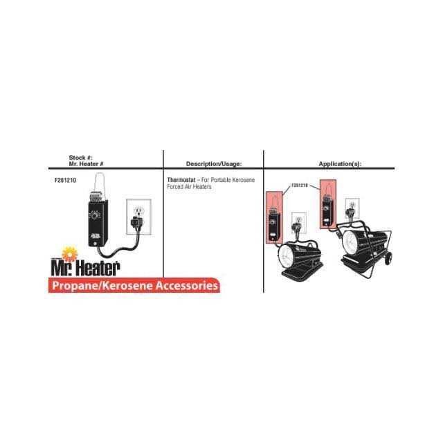 The Mr. Heater MH-F261210 Thermostat adds more control to your existing kerosene heater, ideal for controlling your heat. The adjustable thermostat gives you total command of your environment. The compact temperature adjuster is compatible with any Mr. Heater MH50KR Portable Kerosene Forced Air Heater, perfect for keeping your garage or workshop warm and comfortable. Running a heater without a thermostat can result in an environment that is too hot with continuous operation and quickly becomes too cold when off. The thermostat solves this problem by giving you total control over your heater’s operation, sensing the air and letting you regulate the ambient temperature from -9.40 to 100 degrees Fahrenheit. Simply plug into your wall outlet and heater, pick your favorite setting, and enjoy a comfortable, warm environment in no time. Whether fixing a heater with a broken thermostat or trying to gain control over your current heater’s output, the Mr. Heater MH-F261210 Thermostat makes you the master of your environment.