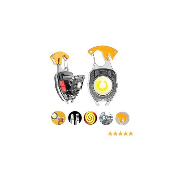 【Multi-Functional Mini Flashlight Keychain】 : This COB keychain light is equipped with 2 different style screwdrivers and 1 Igniters, but also portable keychain, rope cutter, bottle opener, wrench, and whistle for emergency, widely used for fishing, walking and camping, corkscrew, emergency roadside maintenance, Etc. 【Super Bright Pocket Flashlight】: This is Upgraded mini cob technical LED flashlight equipped with high-capacity battery. With the Convex Lens on the surface, it can provide bright light from multiple wide angles, can emit more than 1000lumens lights fully charged for camping, fishing, walking, repairing and searching . 【Multiple Light Modes with Red Light】: The keychain light has 7 light modes: white strong light,white weak light,yellow strong light,yellow weak light,red Light,red flashing light,super strong light, long press the button 2-3 Seconds to maximum Brightness. In the event of an emergency while exploring the outdoors, use the red light to attract the attention of others and call for help. 【Mini Portable Design & Additional Function】: This mini flashlight has strong magnet base. The magnet design allows the lamp to attach to any metal, and 180° foldable handle allows the lamp to be positioned at different angles or hung in certain places. This is not only a Lighting or screwdriver, but also a fire making tools, with sheet fan-shaped tungsten wire, easy to make a fire, very convenient for outdoor camping and hiking or other scenes. 【High Quality Materials & Type-C Rechargeable】: This multifunctional keychain led light is made of high quality Aluminum Alloy material, which is living waterproof, corrosion-resistant, not easy to rust and break, reusable and durable. This pocket light is powered by a 500mAh capacity built-in battery, you can connect it to any USB power source. It has 4 power display, which can monitor the power usage in real time, and charge it at any time when the power is insufficient. Material: Aluminum alloy br Battery capacity: 500MAH br Power supply type: Rechargeable br Power: 5w br Light source form: LED br Applicable environment: Diving, hiking, camping, self-defense, br teaching, search, hunting, daily carry, night riding, cave exploration, night fishing, patrol br Power generation method: TYpe-C charging br 180 degree rotation: Yes br Configuration charger: Yes br Maximum range: 100m br