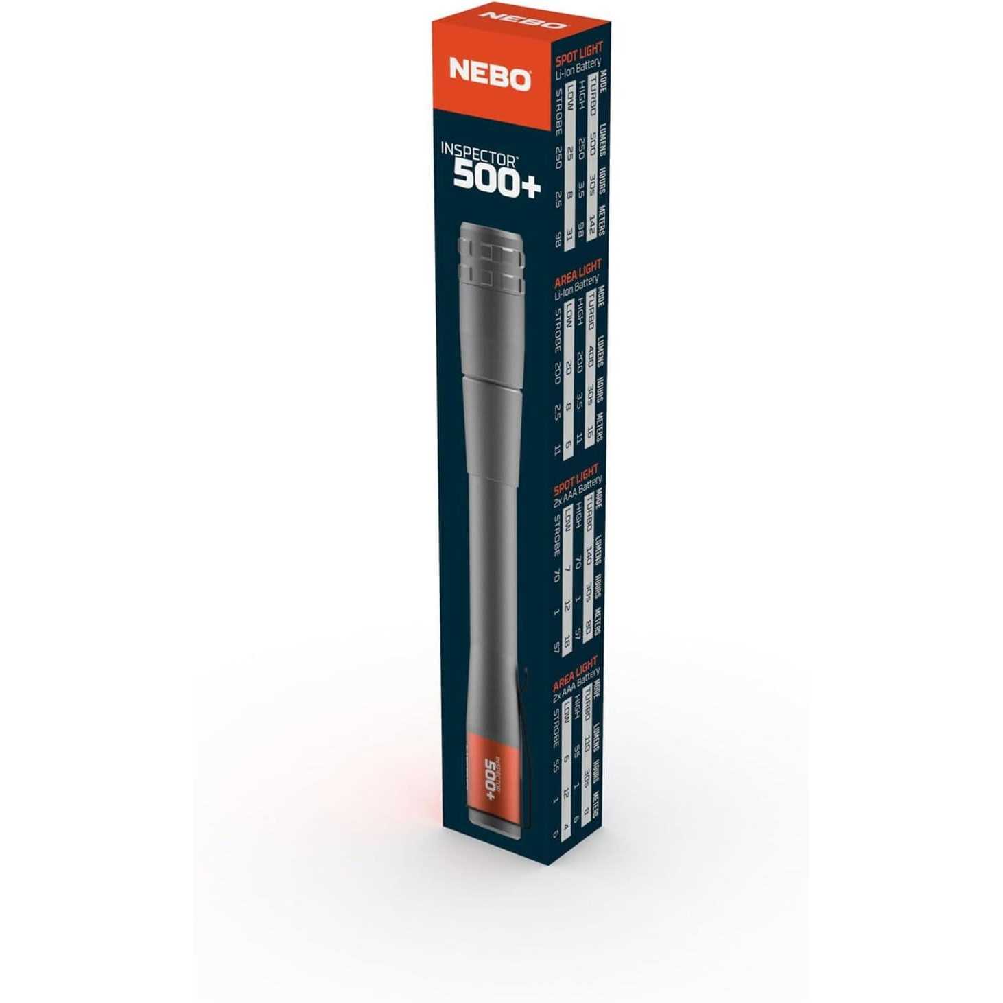 Handheld Flashlights by NEBO. Details:The Inspector 500+ from NEBO is a USB-rechargeable pen light that packs 500 lumens of brightness in an aircraft-grade aluminum body. With a steel belt and pocket clip included, magnetic base for hands-free lighting, and IPX7 waterproof and impact resistant design, this pen flashlight is perfect for any situation. It also features Flex-Power Technology so it can switch from rechargeable to alkaline batteries, giving you up to 8 hours of run time depending on the light mode you choose. The charging cable is included, so you can be sure your Inspector 500+ is always ready to go. This pen light and pocket flashlight is perfect for everyday carry, or for use by professionals who need to inspect things in low-light conditions.