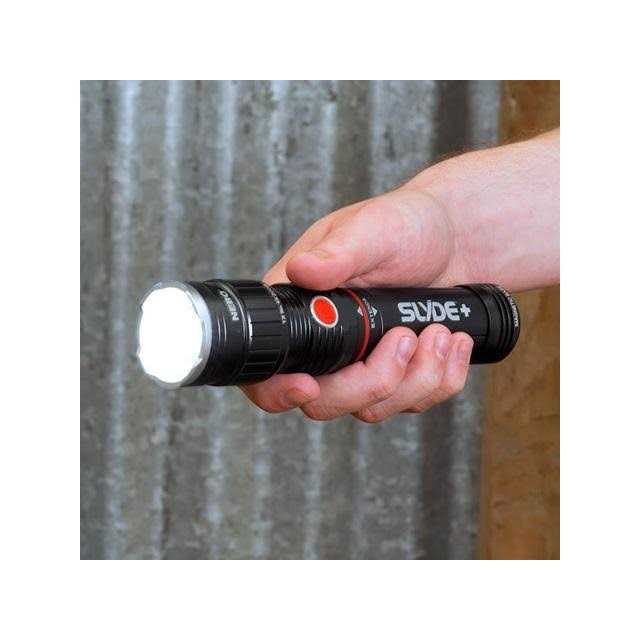 It’s better than ever! We took our best-selling SLYDE Flashlight & Work Light and improved it every way imaginable. The new SLYDE + is now equipped with programmable memory settings for each light mode, a new COB red light function, a 4x adjustable zoom and instant slide on.