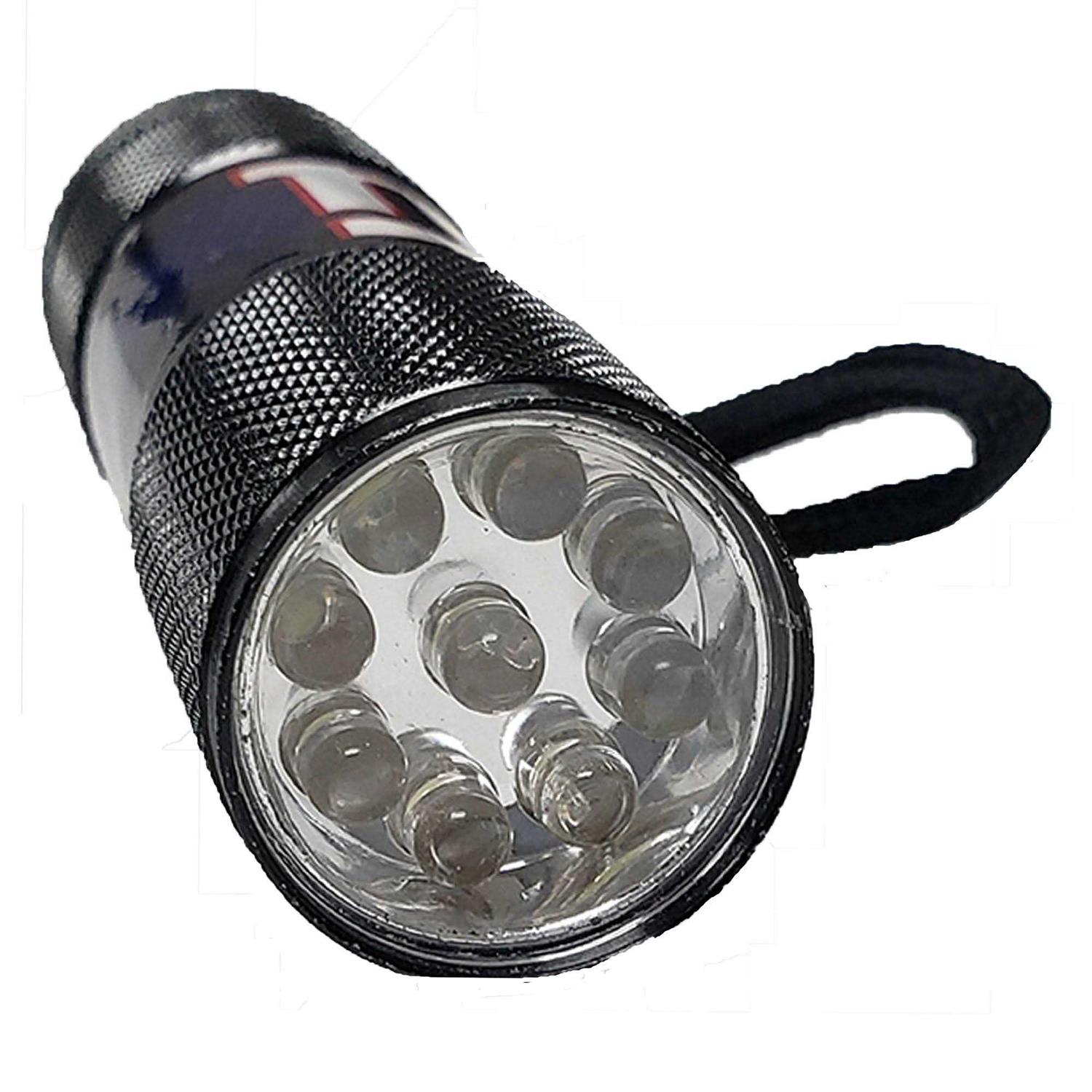 None Made in US LED Flashlight Decorated with Team Colored Logo Features 9 Super Bright LEDs Flashlight Lasts Up To 100,000 Hours Made of Tough, Water Resistant Aluminum Construction Includes Lanyard for Easy Hanging and Carrying Need a light? Try the Team ProMark LED flashlight, featuring your NFL team’s logo on the handle. It’s made with 9 super-bright aluminum bulbs that will illuminate the surrounding area for up to 100,000 hours. It’s water resistant and comes with an attached lanyard for easy carrying.