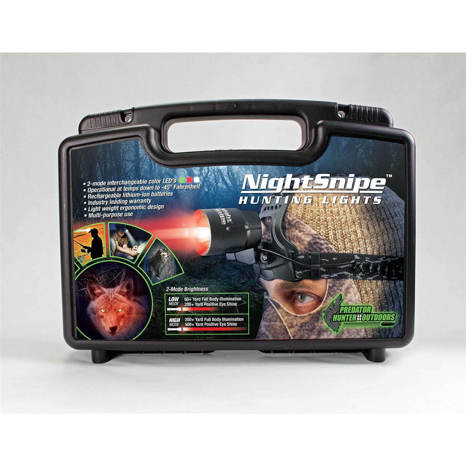 The brightest, farthest shining headlamp in its class! The all new NightSnipe interchangeable LED headlamp / scan light by Predator Hunter Outdoors!! Originally designed for the predator hunter, the NightSnipe line of headlamps soon became recognized as the ultimate, do- all headlamp by professionals in a variety of different fields. Whether it’s Predator hunting, coon hunting, deer hunting, fishing, camping, working, or anything else done in the dark, the all New NightSnipe headlamp has you covered. Depending on your need, you can change your LED color module (available in red, green and white) in less than 30 seconds making this the only headlamp you will ever need. Rated at an astonishing 1200 lumens it will light up the night like never before. Unlike most headlamps that use weak powered “one time use” batteries, the NightSnipe uses 2 extremely powerful 3.7 volt lithium (10 year rated) rechargeable batteries that are included in the kit. These are the same batteries that power our top of the line NightSnipe hunting light gun and bow kits; a nice added bonus that keeps both power sources consistent, easily swappable and chargeable in both light charging sources. The NightSnipe headlamp housing is constructed of lightweight/high strength aluminum alloy that will withstand years of use in a variety of extreme environments. The lens of the lamp is coated, tempered glass that will not scratch and fade like most lenses on the market. Available in red, green and white LEDs.