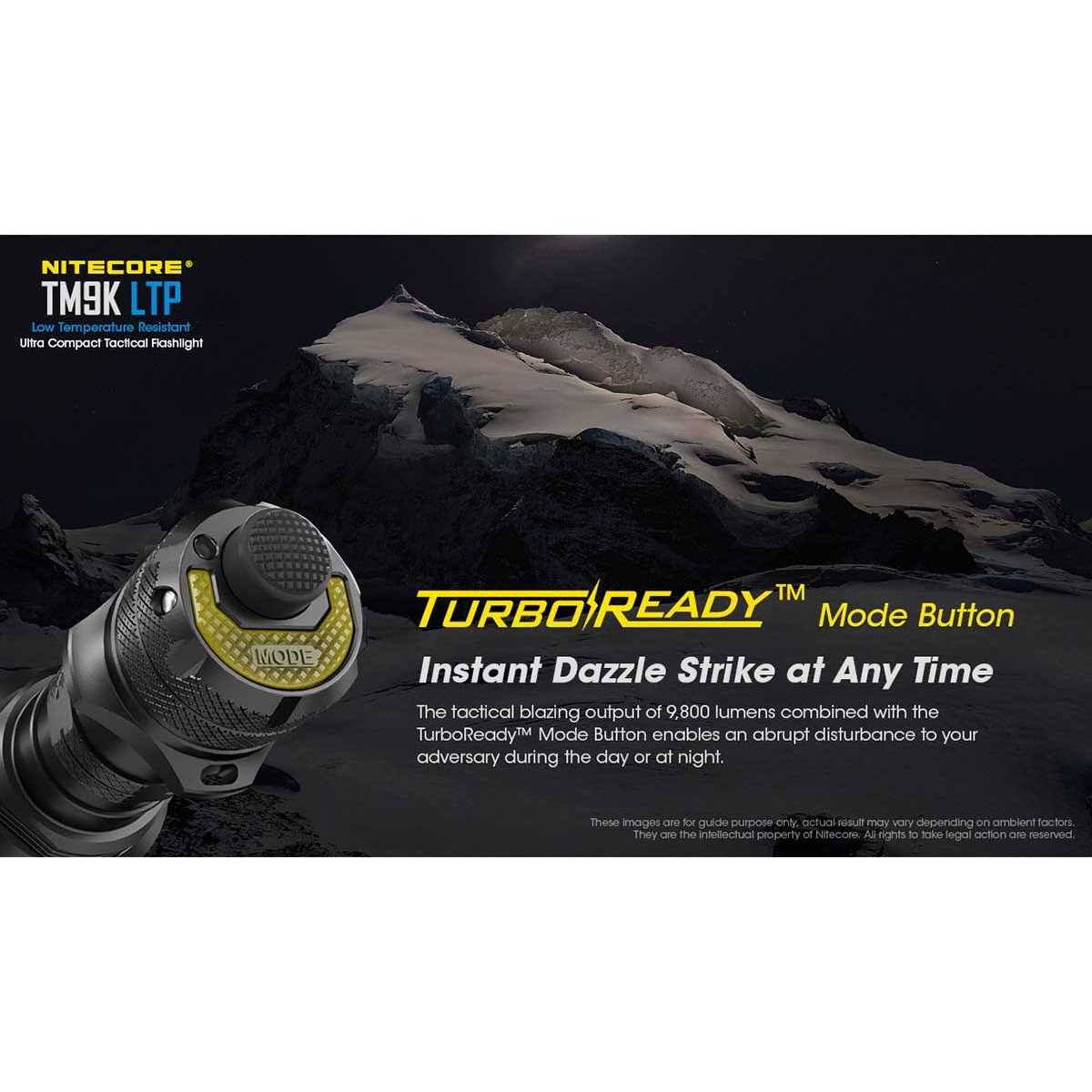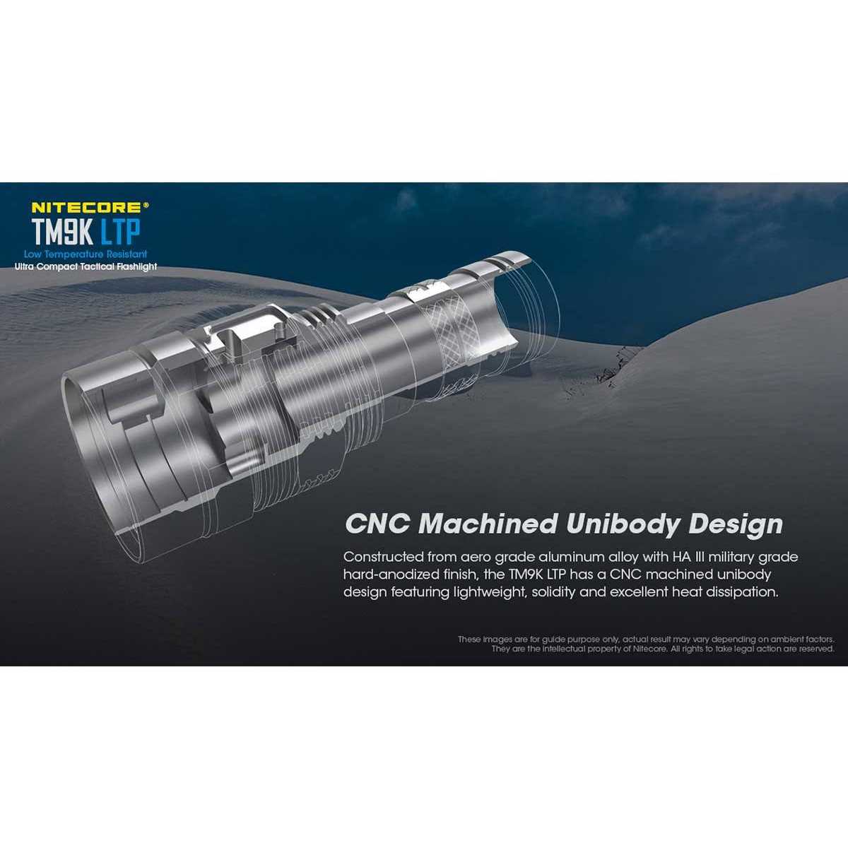 Nitecore TM9K LTP Rechargeable LED Flashlight A Search Light for The Coldest Environments Do you need to go on a search deep into the cold? Make sure you take the TM9K LTP with you! With a maximum output of 9800 lumens over 280 meters, this light is perfect for search and rescue missions in the toughest conditions. Thanks to its specialized Low Temperature Protection, this version of the TM9K can be used in temperatures as low as -40 C, giving you flawless visibility in bitter cold environments for activities like mountaineering! Tactical Features for Your Safety The TM9K LTP is designed with incredibly effective tactical features to ensure your safety in emergency situations. With the included Strobe mode, you defend yourself with this light’s astounding 9800 lumens! The stainless steel strike bezel provides you with the perfect tool for breaking through glass in case of a car accident to keep yourself safe.