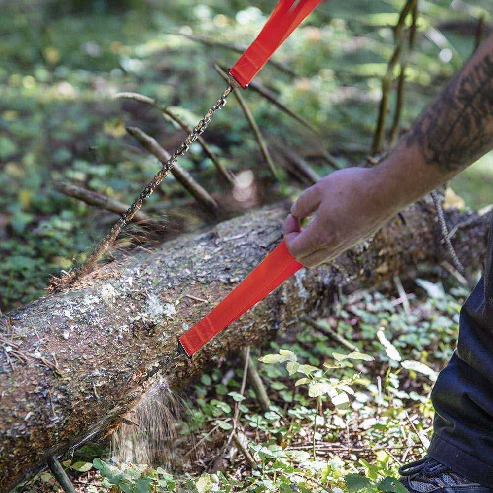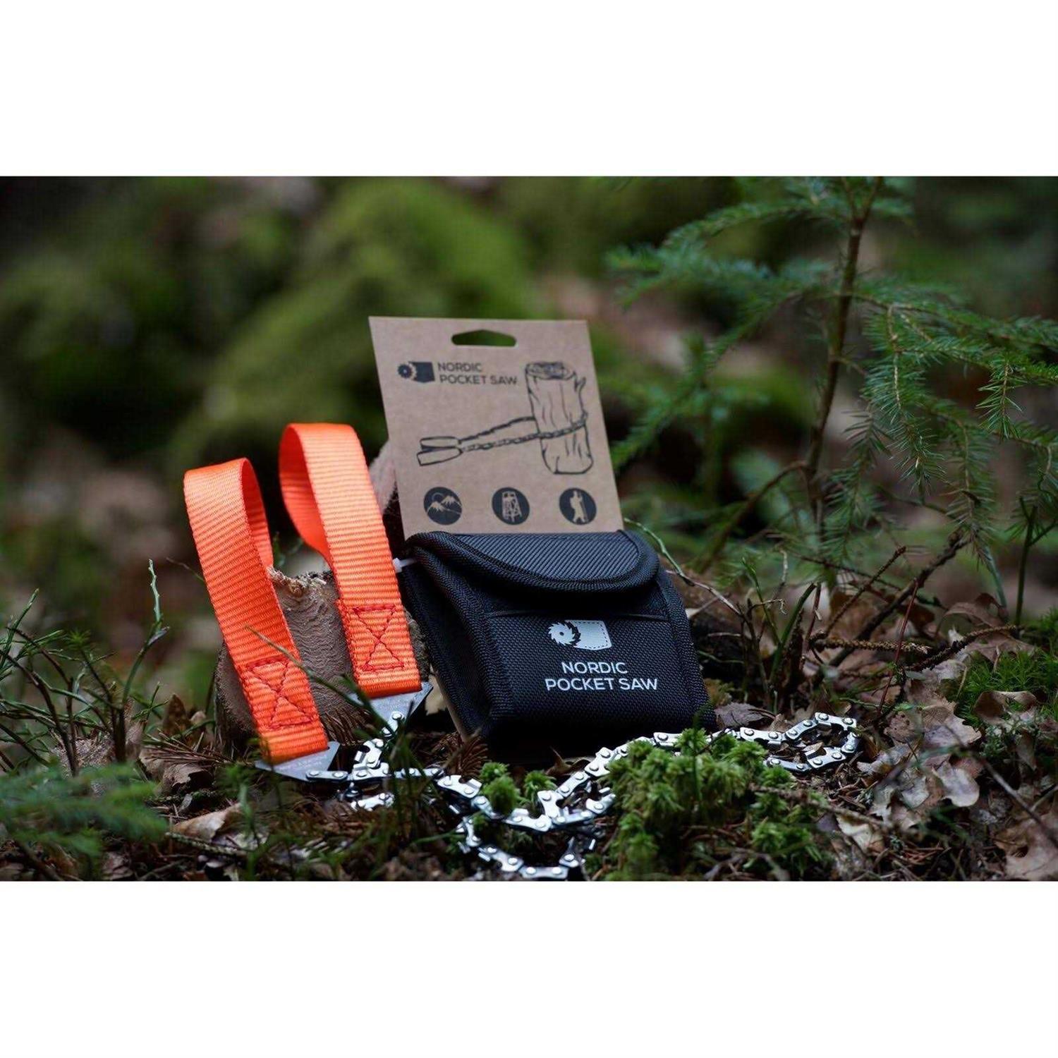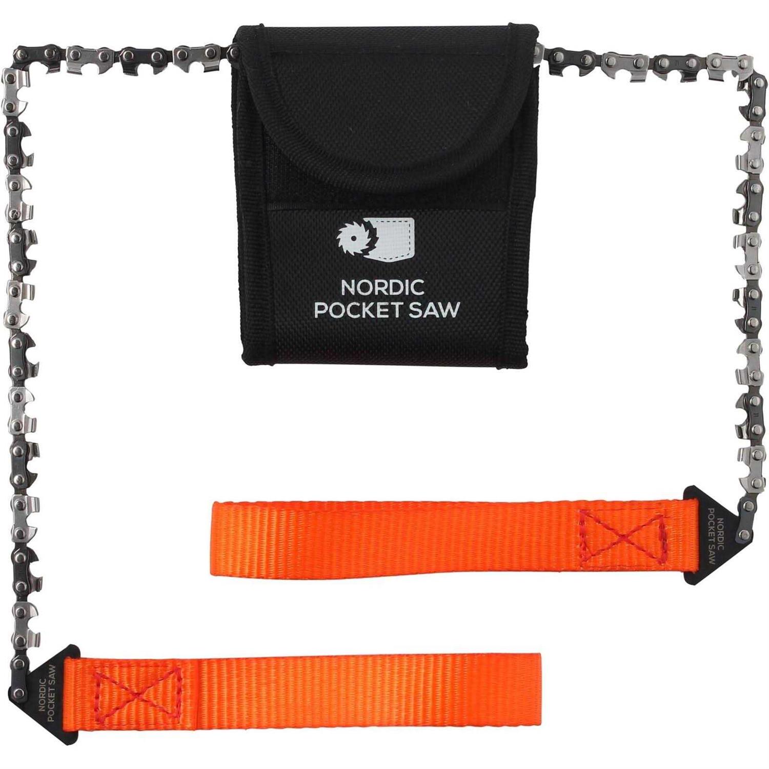 The Nordic Pocket Saw is extremely powerful, lightweight and fits comfortably in the hand. The 65 cm long, heat-treated carbon steel chain uses double cutting teeth in each main chain to ensure efficient cutting movement in both directions. The chain also sets this saw apart from all other hand-held chainsaws on the market. High-strength nylon handles are extremely durable and ensure comfortable and safe storage even in damp or cold weather. The handy nylon pouch can be worn on a strap for easy access or stored in a backpack. In summary, the Pocket Saw Nordic is an indispensable companion for your adventures in the harsh conditions of nature.