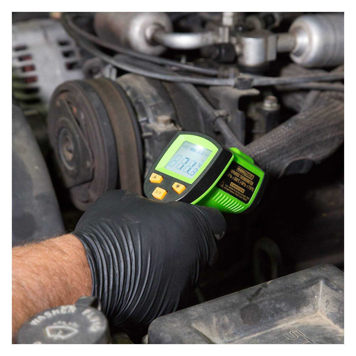 The OEMTOOLS Infrared Thermometer is a non-contact thermometer that is point and click to determine temperature range and features a laser pointer to identify the spot to be measured. It reads both Fahrenheit and Celsius scales. It boasts an accuracy of +2.5% of reading or 2.5 Celsius.