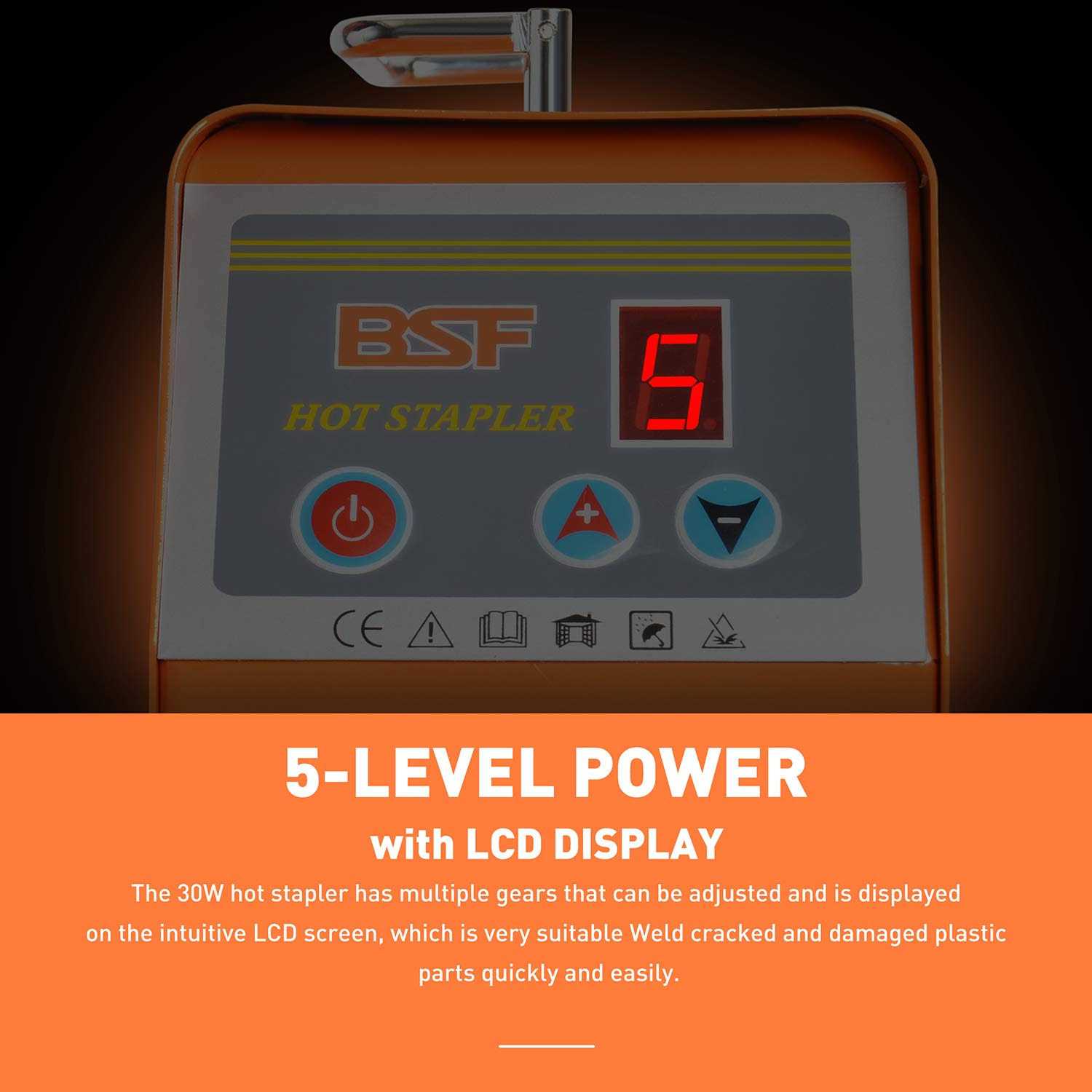 OIMERRY Plastic Welder Hot Stapler with 800pcs Staples, 110V Bumper Plastic Repair Welding Kit Save your time and improve the weld experience when using this 30W Hot Stapler Plastic Welding Kit with 5 adjustable heat levels to weld the cracked and damaged plastic parts. This plastic stapler gun with LED indicator will let you quick and easy to repair the broken and damaged plastics of automobiles, motorcycles, ATVs, boats and industrial applications. Bumper Welding Kit heats special staples, and perfectly welds staples and plastic together while still remaining flexibility of plastic. 1x Hot stapler unit, 1x Cutter, 1x Triangle electrode, 1x Power line, and 800pcs staples all included in one suitcase, easy to use and carry. The hot stapler have acquired the CE and FCC Certifications.