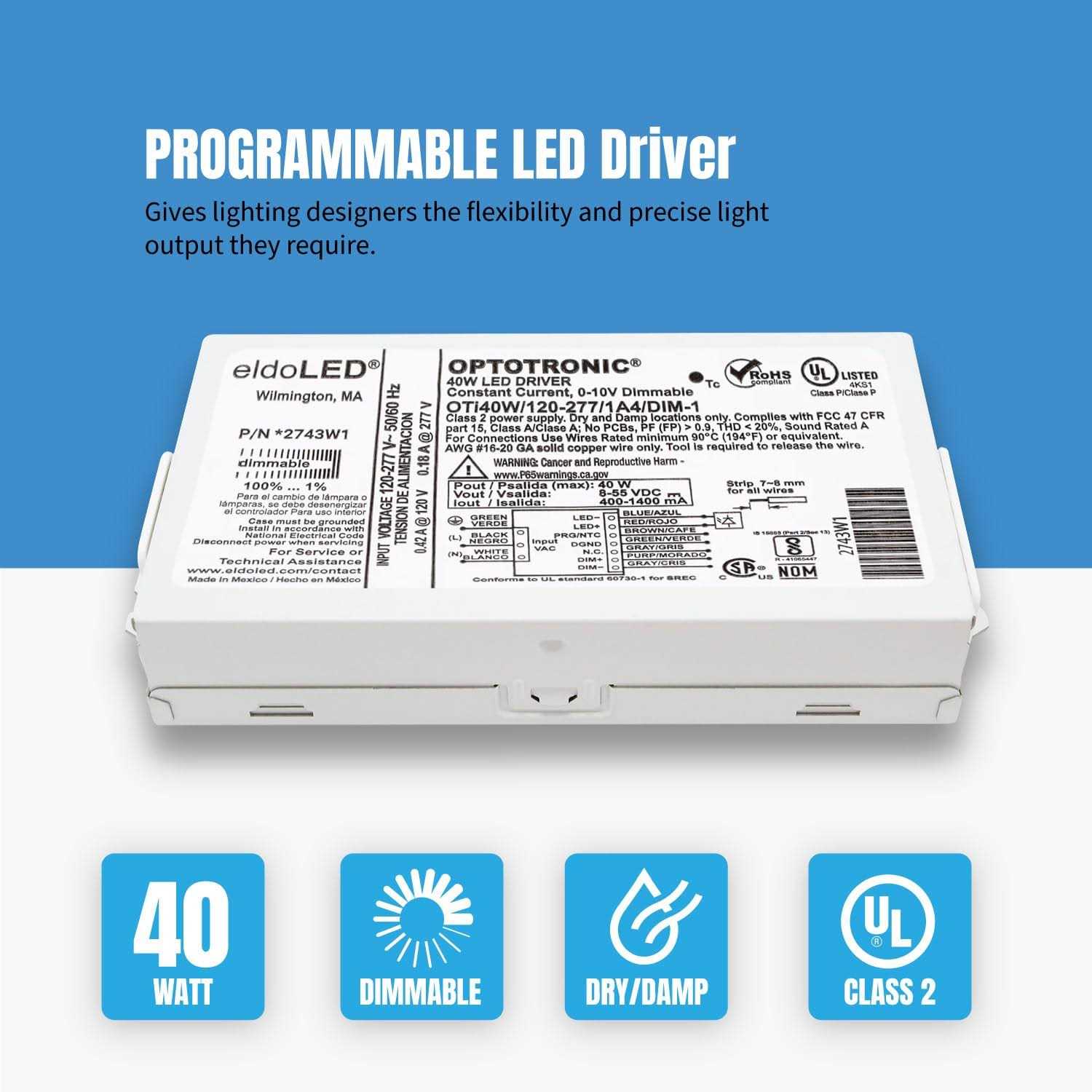 Dimming levelDim-to-offSoft Start – LED thermal protection – Vaux 12/20/24VConstant lumen output – End-of-life indicator Output current Dimming level Dim-to-off Soft Start LED thermal protection Vaux 12/20/24V Constant lumen output End-of-life indicator Input – Voltage: 120-277V +/- 10% Frequency Range: 50-60 Hz +/- 5% Max. Output Power W: 40W Dimming Control: 0-10V Isolated Dimming Range: 1-100% Output Voltage VDC: 8-55VDC Output Current m – A: 400-1400m – A 1m – A Step, Default 700mA Product Dimensions L x W x H: 5.0 inch x 2.4 inch x 1.2 inch Product Weight: 7.8oz Quantity: 1 UL Environmental Rating: Dry and Damp Output current Dimming level Dim-to-off Soft Start LED thermal protection Vaux 12/20/24V Constant lumen output End-of-life indicator Product Family Features Universal input voltage – 120277VAC 50/60Hz UL Class 2 output for safe operation Protection against line voltage on 0-10 V dimming wires AUX output models available Custom programmable with 1m – A resolution to perfectly match LED load and maximize performance Programming does not require powering up or connecting the power supply to AC line voltage Wide output current and voltage range Available in dimming to 1% with 010 V dimmers Integrated OEM programmable features include: constant lumen maintenance, end-of-life indication, LED thermal protection, Vaux 12V/20V/24V, soft start, and dim-to-off Available with mounting feet F-style or PEM studs J-style to simplify installation Conforms UL SREC for NTC based thermal protection Areas of Application Downlights, In-grade fixtures, Recessed troffer, Wall Washing
