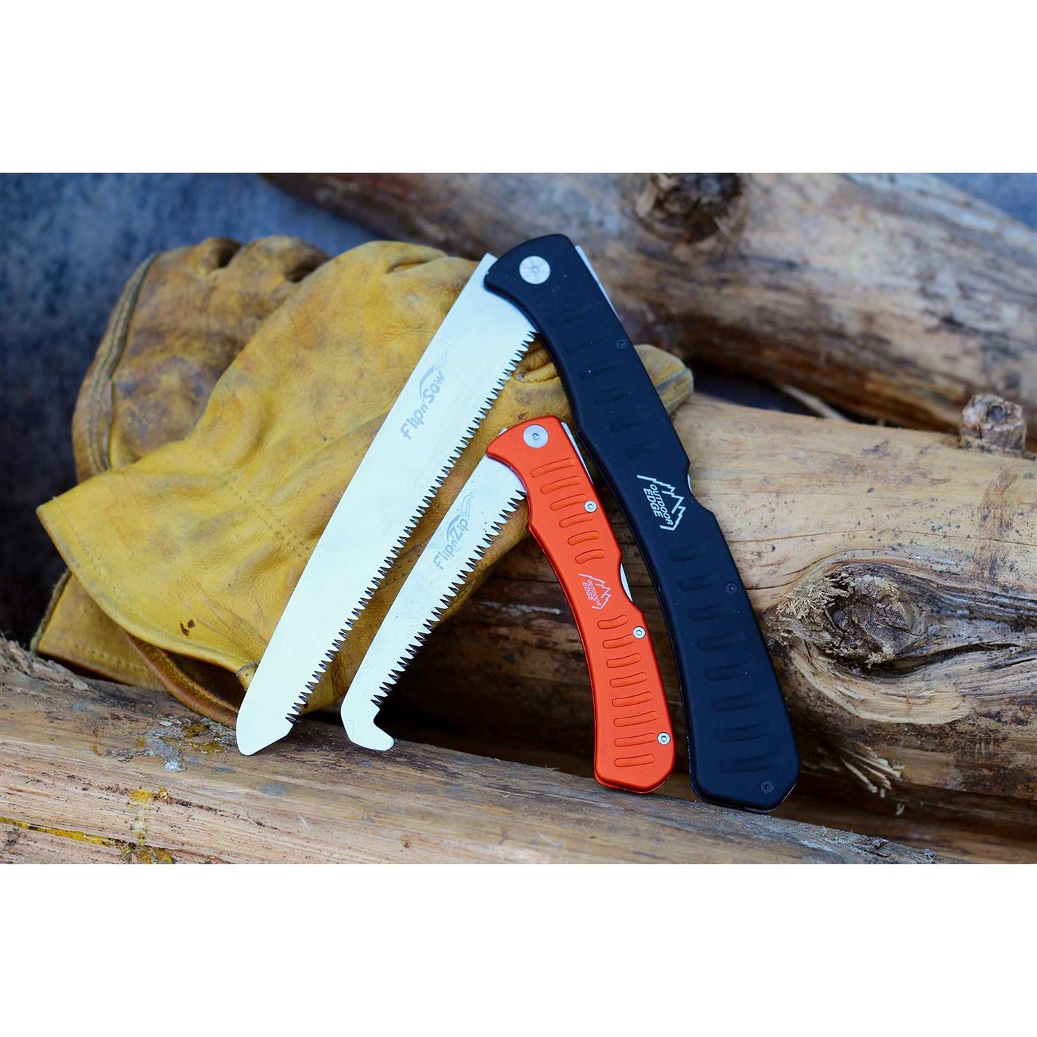Flip n’ Zip SawOutdoor Edge This compact folding saw features a 4.4 inch 65Mn spring steel blade with triple ground tooth pattern to create an aggressive cutting edge for penetrating tough bone and wood. The 6061-T6 aircraft grade aluminum handle is anodized orange for high visibility in the field and finished with a thin rubberized coating for a secure, non-slip grip. Comes complete with a Kryptek Highlander nylon sheath.