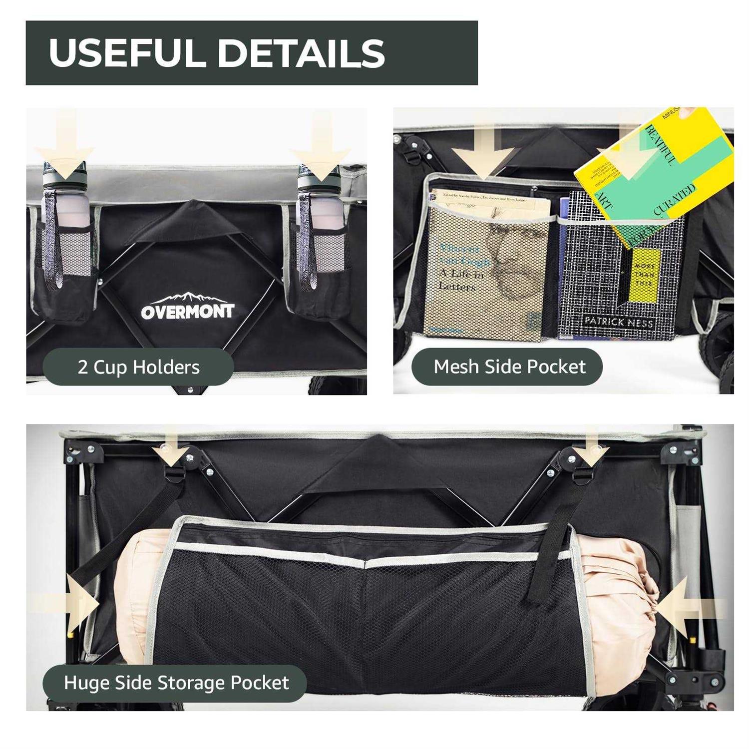 Sufficient Storage Space – The extended dimensions of the Overmont trolley are 90 x 58 x 51 cm and provide enough space to store items. Thicker, tear-resistant oxford fabric increases durability and can be easily disassembled and cleaned. 【360 Swivel Wheels & Adjustable Handle】360 swivel front wheels allow this trolley to move smoothly on any terrain, and the adjustable handle design can accommodate people of different height for comfortable use. Multiple angle adjustment makes it easy to pull, maneuver and use the trolley. 【EXCELLENT LOAD CAPACITY】Our folding trolley is built with a sturdy steel frame that can hold up to 120kg. The removable wheels are wider than other folding trolleys, and the extra wide 10cm wheels feature a unique non-slip pattern, making it easy to cross different terrains, including beaches, lawns and even uneven surfaces. 【Extra Storage Space】Overmont portable four-wheel camping cart comes with a large side storage bag and 2 easy-access cup holders that provide 20% more storage space than other cars. Suitable for camping, BBQs, shopping mall, hiking to the park, beach or sporting events. 【Compact & Easy to Use】Our camping trolley is designed with a fully foldable structure, so it can be easily unfolded and folded in seconds. This practical folding garden trolley can be folded compactly to the dimensions of 23 x 37 x 65 cm and allows for effortless storage in the trunk and a practical transport option.