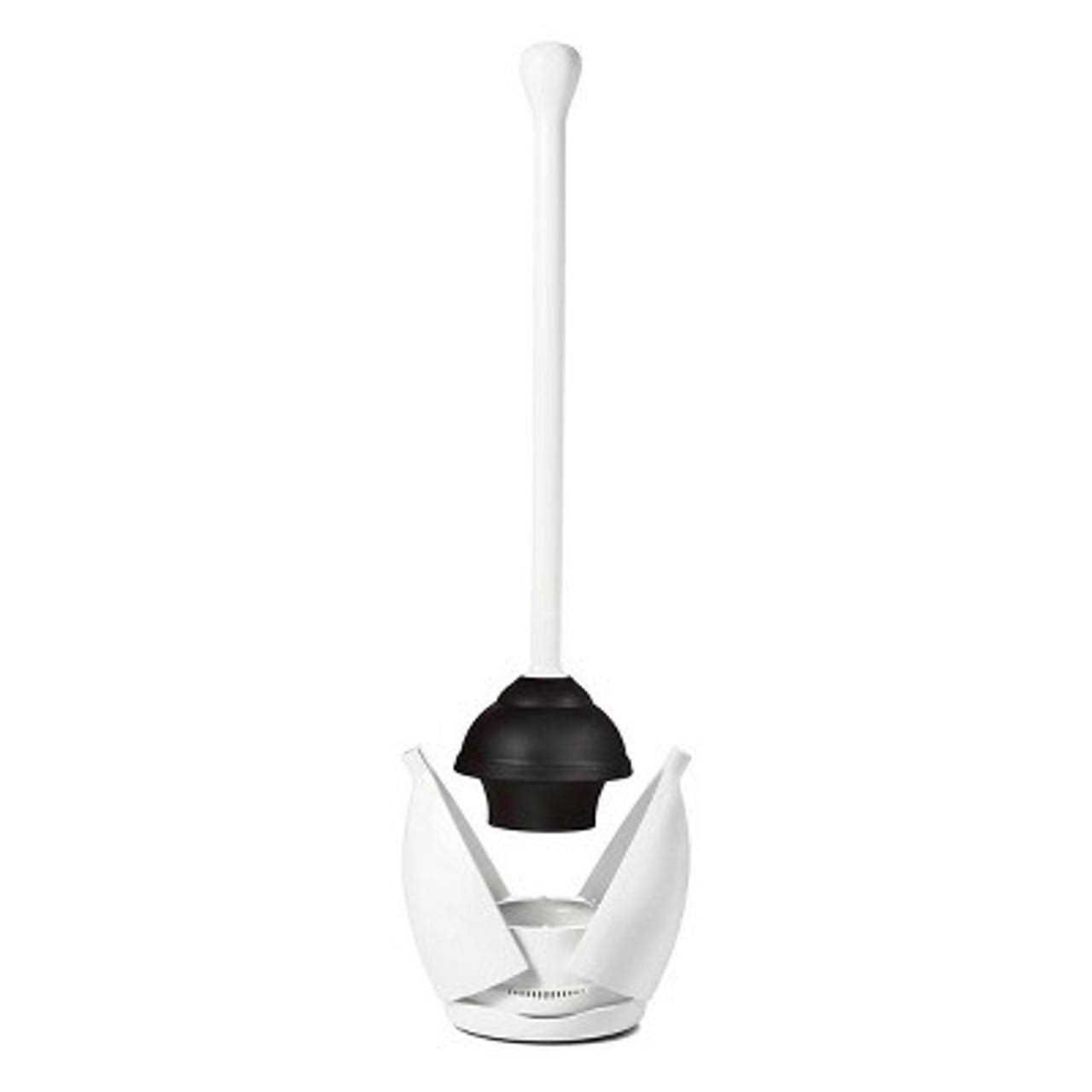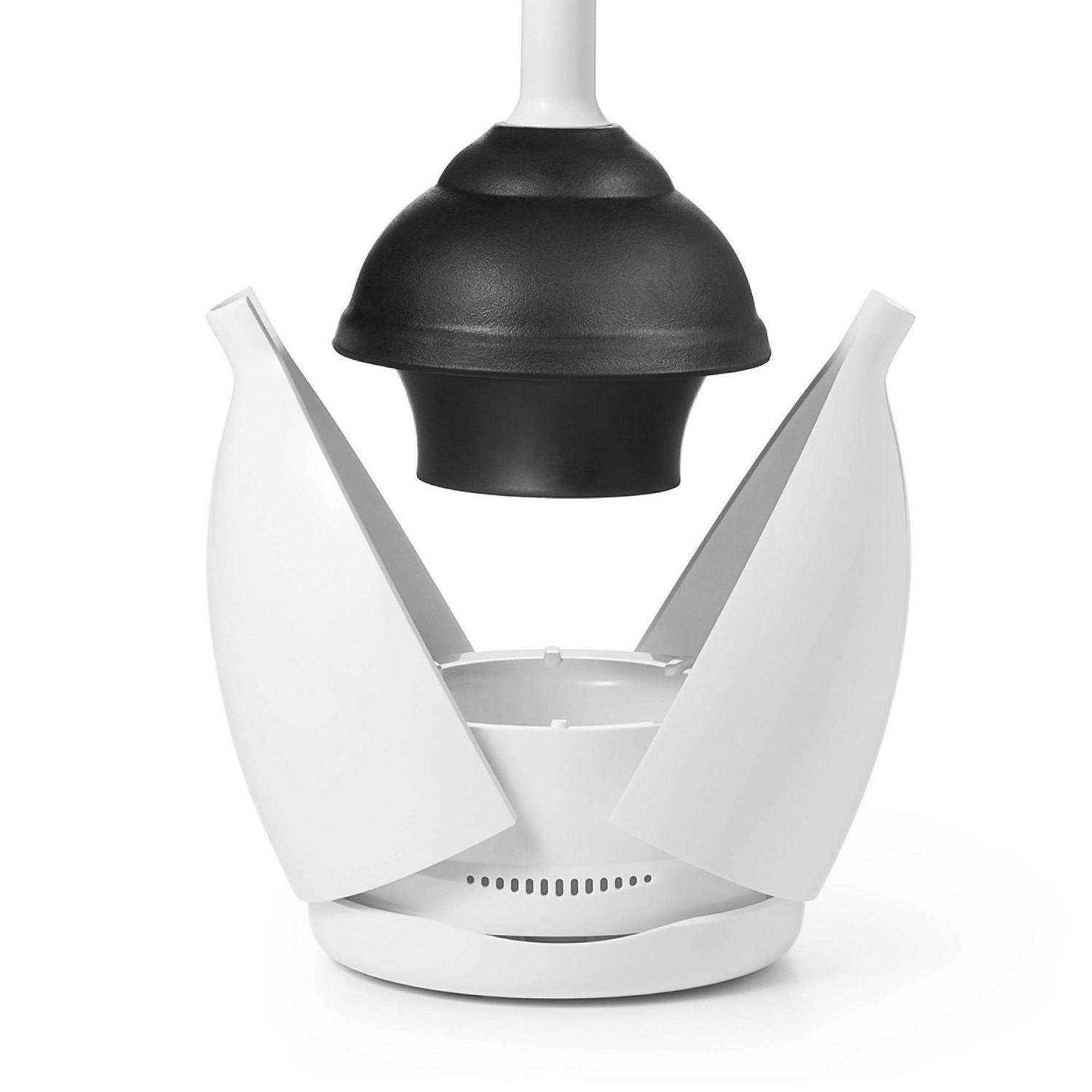 The OXO Toilet Plunger and Canister is a hassle-free way to keep your bathroom in order. The Canister doors open as you lift the Plunger and automatically close when you replace it. The internal drip tray features ventilation slots that allow excess water to evaporate. Our flat-top handle is comfortable to hold and use. Designed for use on most toilets, the Plunger head is even effective on low-flush models. The discreet Canister keeps the Plunger out of sight when not in use.