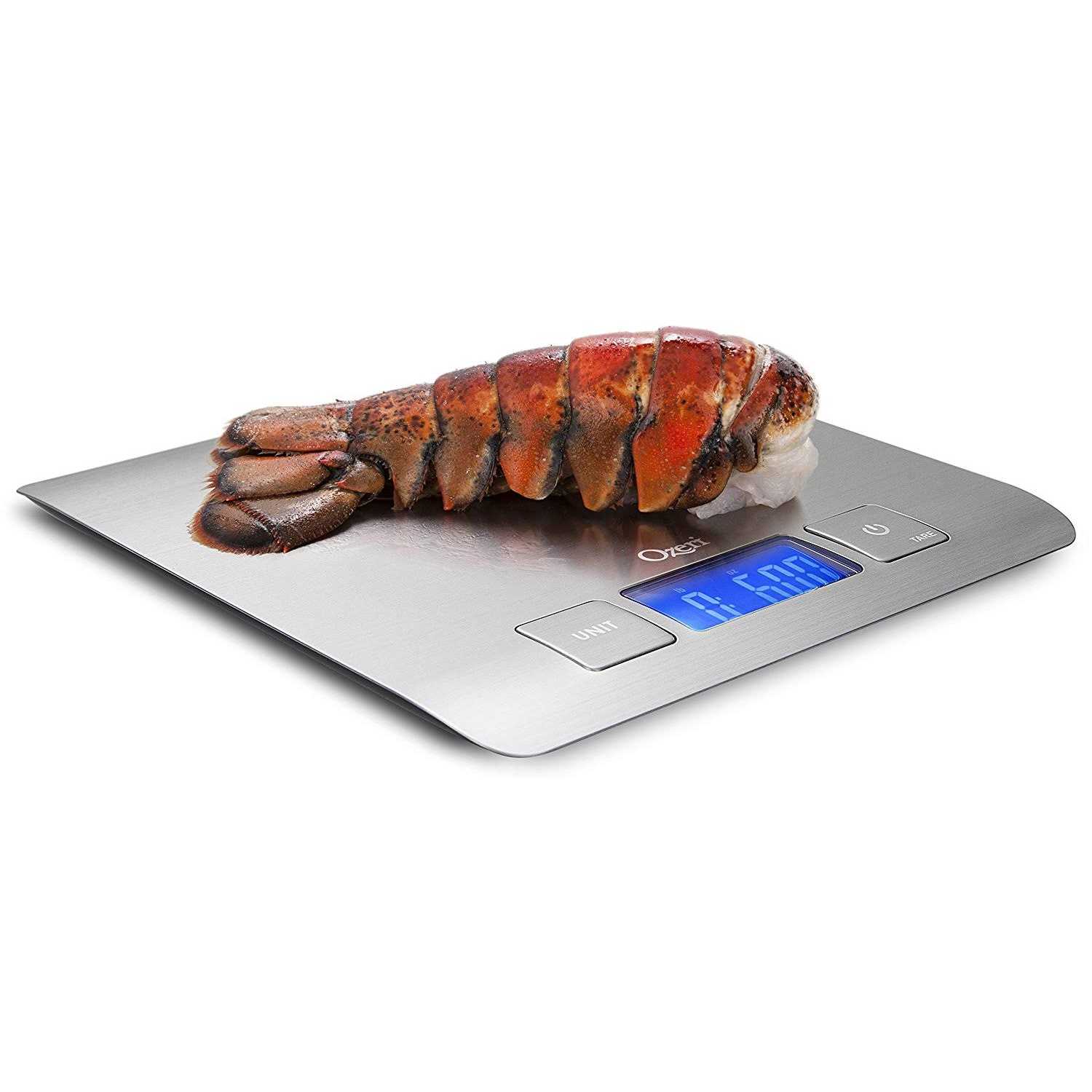- Large high-contrast blue backlit LCD screen displays weights in pounds (lb), ounces (oz), grams (g), fluid ounces (fl.oz.), and milliliters (ml).