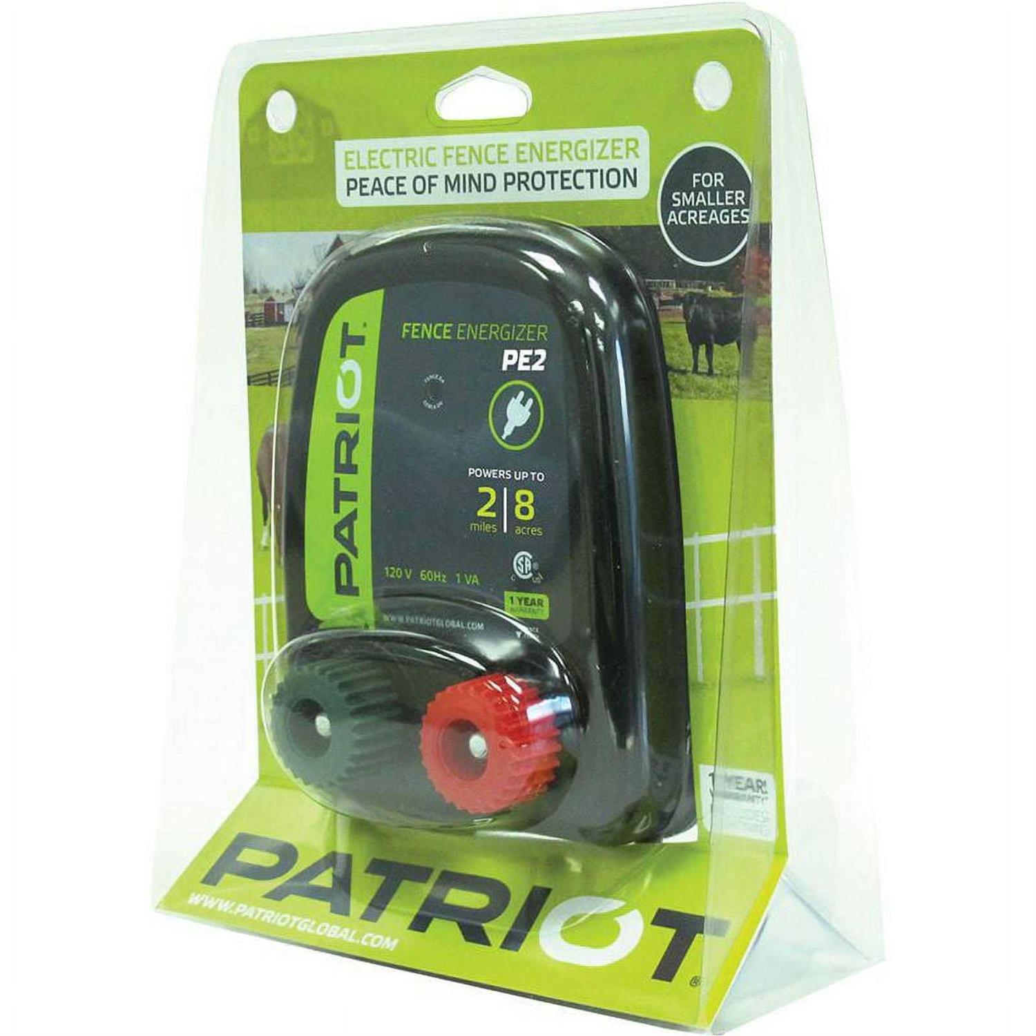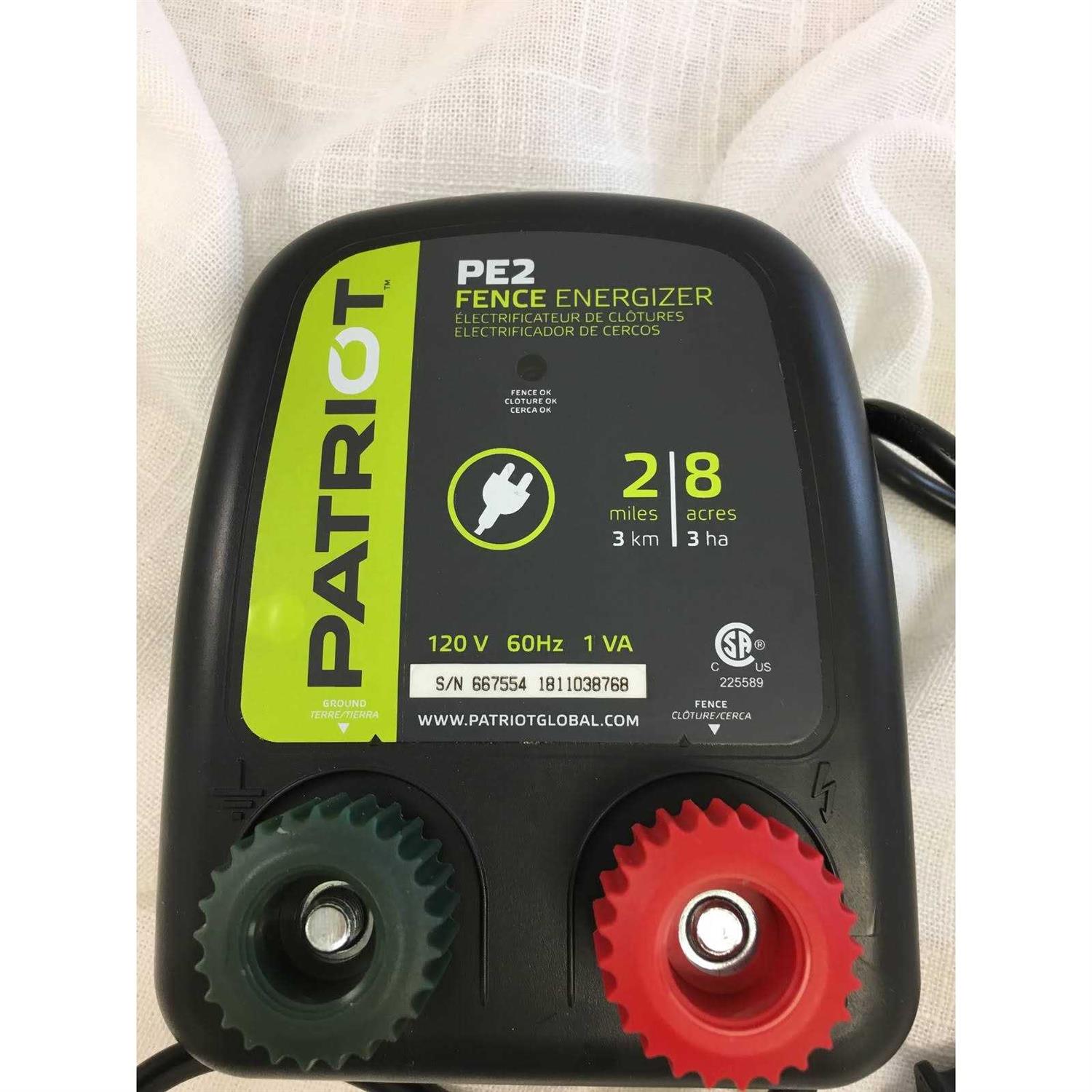 The Patriot PE2 electric fence energizer is a 110-Volt AC plug in 0.10 Joule model that is ideal for containing pets and keeping out small nuisance animals. Low impedance energizer designed to deliver poer to the end of the fence, even under heavy load (Foliage, undergrowth). Has a LED indicator that pulses when energizer is working.