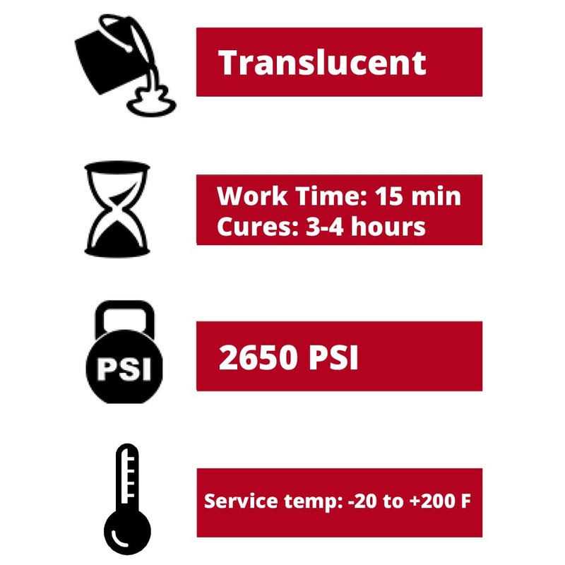 • Provides work time of 15 minutes, cure time for service of 3 to 4 hours, and full cure time of 3 to 7 days