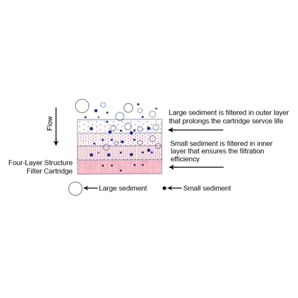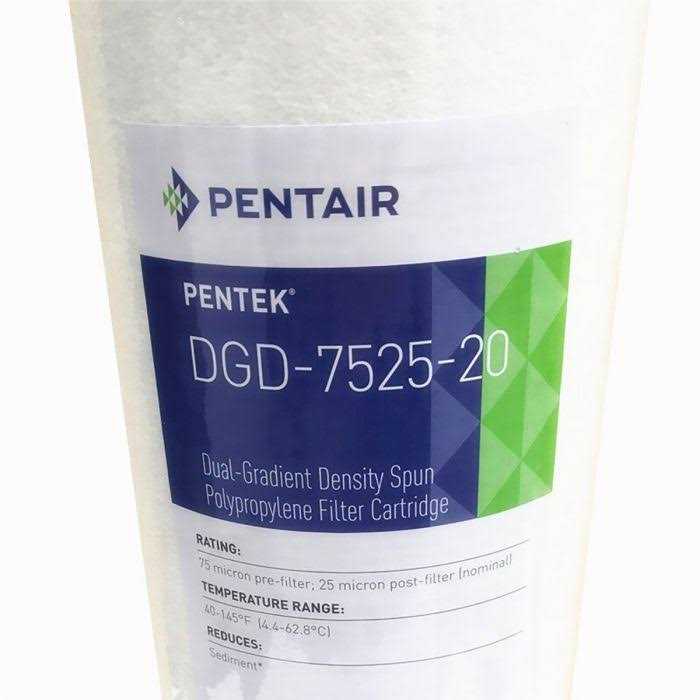 Dgd series cartridges are manufactured from 100 percent pure polypropylene and are sized for use in our big blue filter housings. Dgd series cartridges are designed for purity and will not impart taste, odor or color to the liquid being filtered. Additionally, the polypropylene construction provides superior chemical resistance and is not prone to bacterial attack. The dgd series advanced design combines selectivefinal filtration with appropriatepre-filtration to achieve up to three times the dirt holding capacity of similar size sediment cartridges and many more times that of standard spun or string-wound cartridges. This performance enhancement is achieved by combining two separate gradient layers in one filter. The larger diameter of the pre-filter reduces the particle load to the post filter, allowing it to operate at higher velocities. The effective filter depth is increased to a full 233 percent of standard spun-polypropylene or string-wound filters. This increased depth provides for very high particulate reduction efficiencies and added loading capacity. The unique design and performance characteristics of the dgd series cartridges make them an excellent choice for all residential, rural, municipal and commercial applications. Micron rating maximum dimensions model pressure drop 25 4.5 X 20in dgd-7525 1 psi 20 gpm.