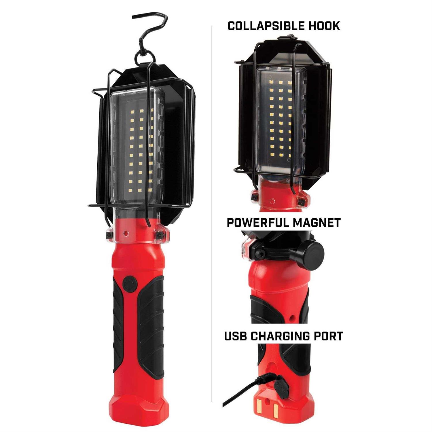 The Wilmar 1200+ Lumen LED Drop Rechargeable Light has all the durability of a traditional drop light with the efficiency of LED technology. Impact resistant handle with non-slip rubber grip and magnetic bracket. Powder coated metal lamp shield with swivel hang hook. Specifications: 1200 lumens, 2 hour runtime, 4 hour charging time, dual built-in 18650 1800mAh cells, 3.7V, 3.6A, 0.9A input current.
