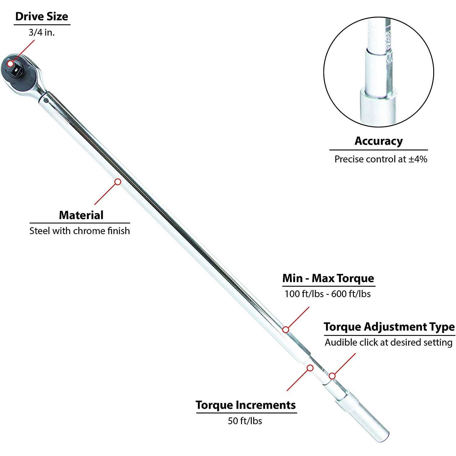- Accuracy: 4 percent +- meets standards for torque wrenches