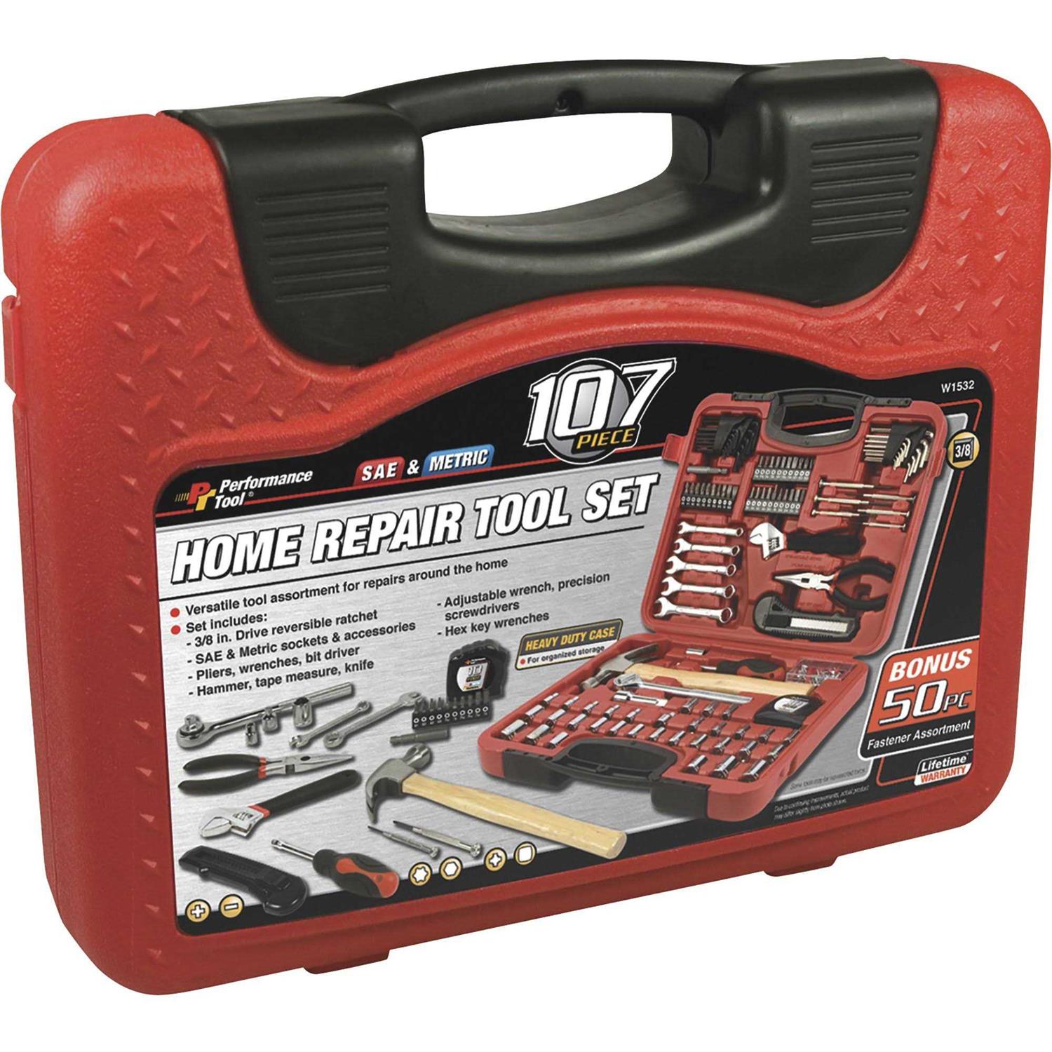 The Performance Tool 107 Piece Home And Auto Tool Set provides all of the essential tools needed for repairs around your house and garage. This set has SAE and metric sockets and accessories.