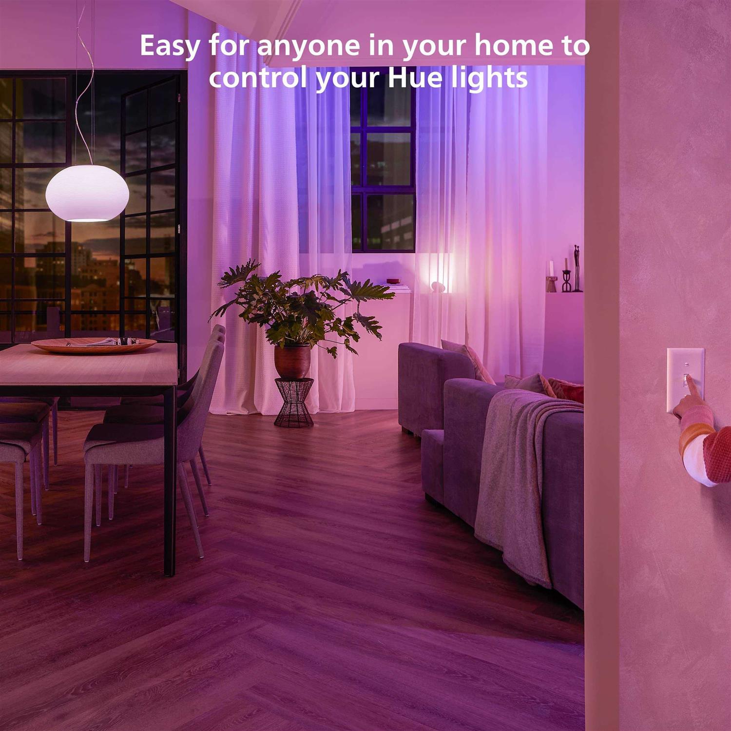 - CONTROL LIGHTS, ROOMS, OR A ZONE: Use your existing light switch to control your Philips Hue smart lights in a Room or Zone.