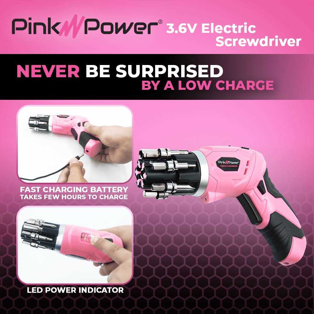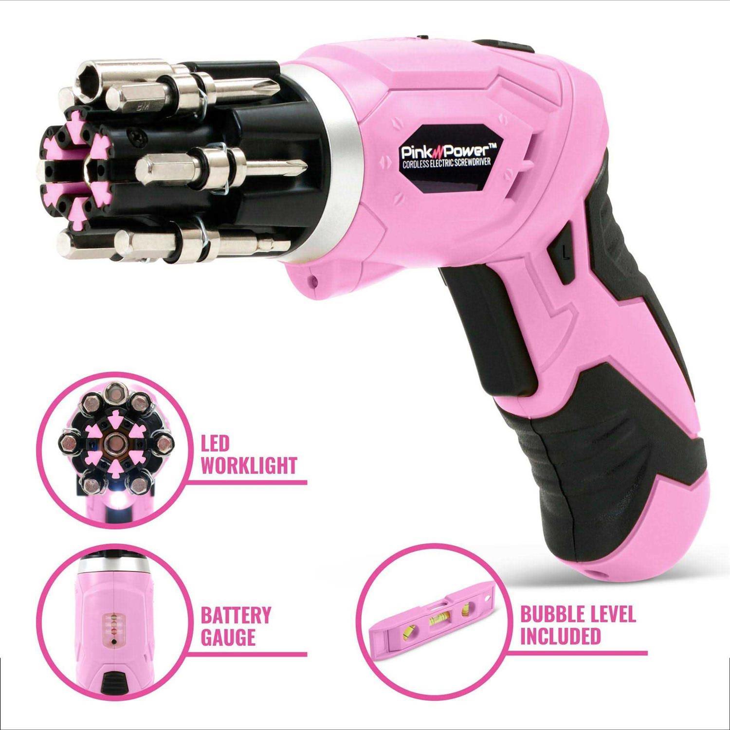Pink Power 3.6 Volt Rechargeable Cordless Electric Screwdriver Set with Bubble Level