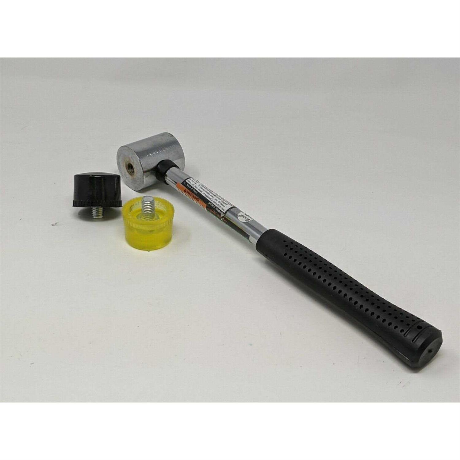 The soft face rubber mallet has two replaceable faces, one made of soft rubber and the other of high density plastic. The rugged chrome-plated head and tubular steel shaft are designed to stand up to heavy usage. This lightweight rubber mallet is nonsparking and features a molded cushion grip for comfort and shock absorption.