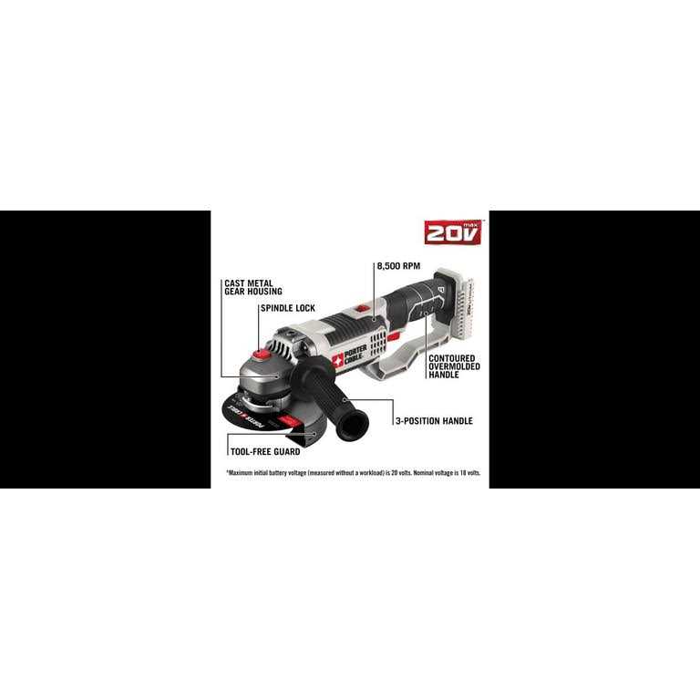 Accomplish challenging cutting, removal, and finishing jobs with the PORTER-CABLE 20V Cordless Grinder with 2Ah Battery. A high-performance motor delivers both power and speed at 8,500 RPM. Work until the job is complete with heat-dissipating cast metal gear housing. A contoured, 3-position side handle designed for comfort lets you navigate your workspace with ease. The cordless grinder also features a spindle lock for quick wheel changes and tool-free guard that lets you adjust the guard to accommodate various applications. A 2.0Ah battery and charger are included with the grinder, ensuring you have everything you need to get to work right away.