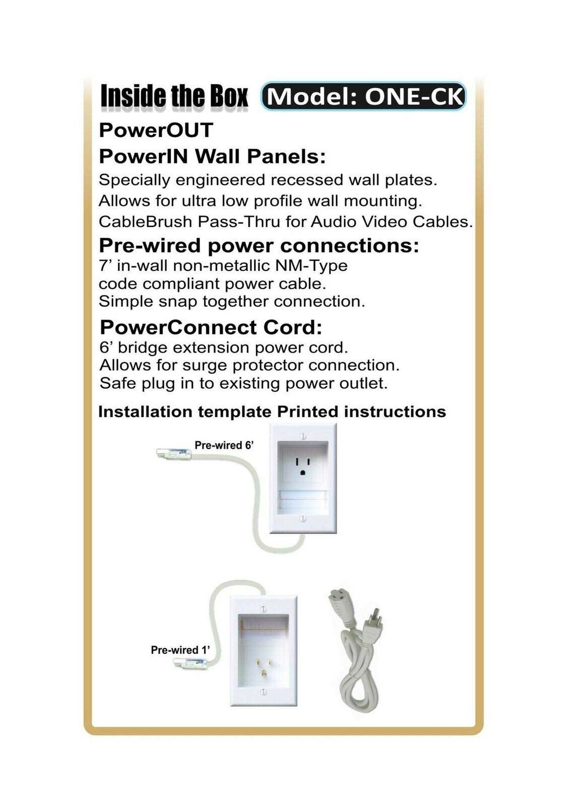 This kit includes a single Power Outlet for mounting one (1) TV. No more messy cables hanging down the wall between the TV and the floor. No electrician needed with snap together Power Connectors. This system allows for Wall Mounted TV’s to hide low-voltage cables and wires routed behind the wall for a clean look. The Included In-Wall PowerConnect Cable and 6-foot Power Cord is code compliant. Does not include HDMI Cables or other Low Voltage Audio Visual Cables. Included Recessed wall mount plates are hidden behind Flat Screen TV Mount and should work with the thinnest TV mounts and thinnest TV’s on the market. Top Rated Product with Simple Easy DIY Installation. Conceal cables and power for your wall mounted TV.Introducing the all new ONE-CK in-wall power and cable management system. Single-gang size all-in-one design. Designed to simplify wiring behind wall-mounted flat-panel TV’s This discreet system allows low voltage cables and wires to be routed through the wall for a clean look. Code Compliant to install power, includes hardware and helpful mounting template make the ONE-CK the perfect do-it-yourself solution for any skill level, without the need for an electrician. No wiring, simple snap together PowerConnectors make this safe and easy.Partner a SBCK kit for your soundbar power or use a CKRE if you need longer in wall power wire.