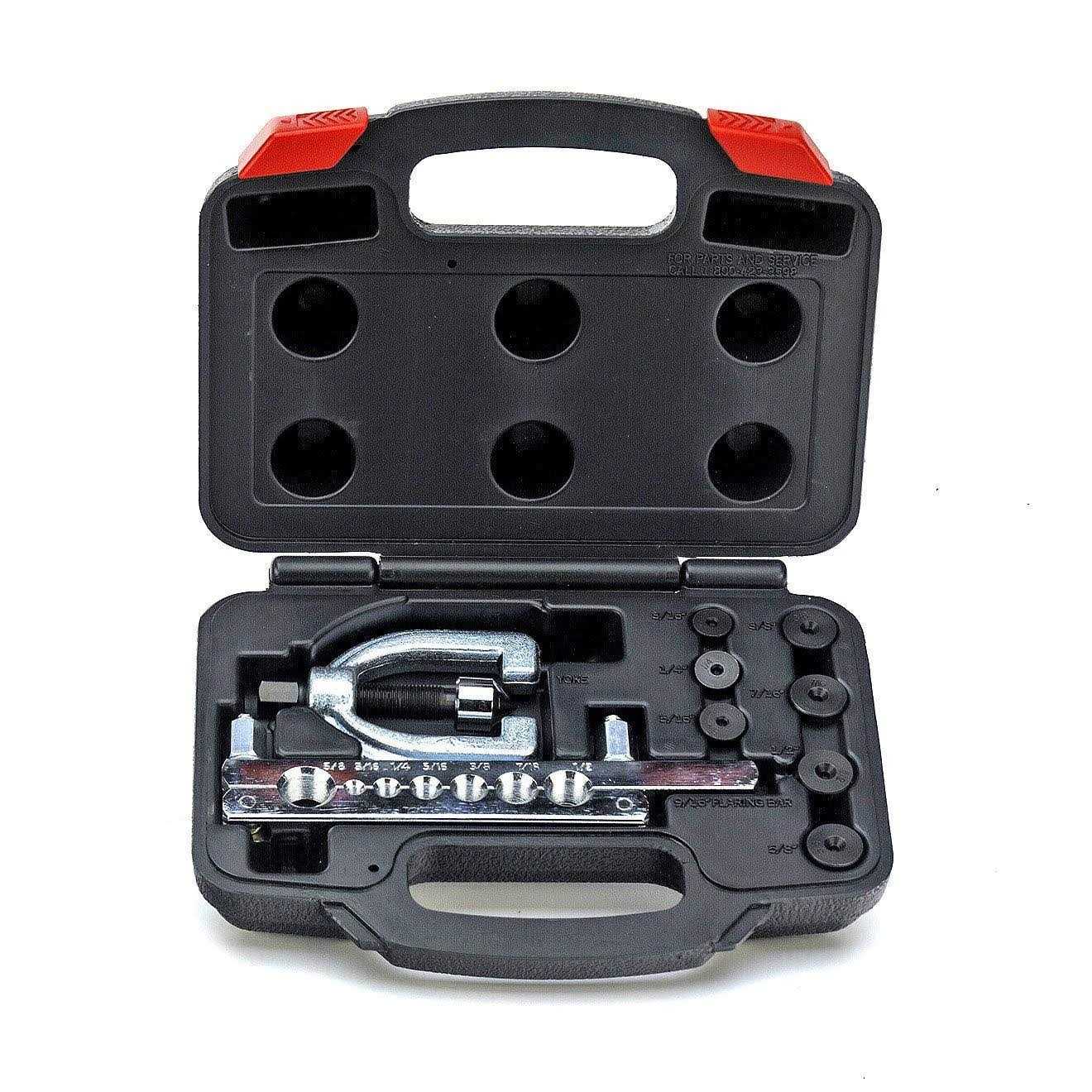 There are times when precision is required, flaring automotive tubing is at the top of the list. Make precision flares in copper, aluminum, and mild steel tubing up to .040-inch wall thickness. The wide variety of included adapters allows flaring on tubing from 3/16-inch to 5/8-inch, plus a 9/16-inch flaring bar to cover most of your automotive needs. Keep your kit well organized and protected for years of use in the heavy-duty carry case. Helpful detailed instructions and usage photos are included.