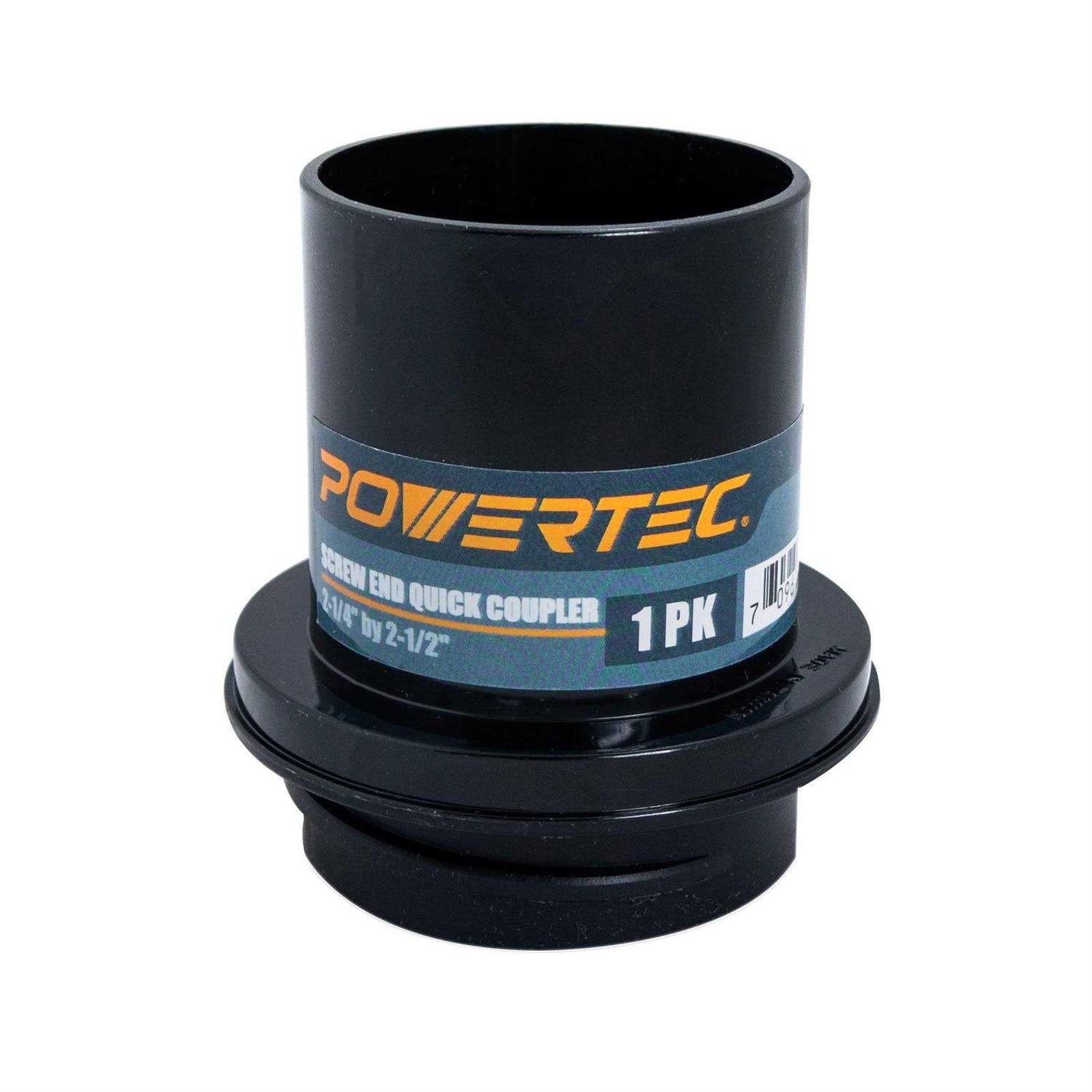 The threaded 2-1/2-Inch end screws firmly into your flexible hose, thus supplying an airtight friction fit. The 2-1/4-Inch end is slightly tapered, providing snug press-on fit to your 2-1/4-Inch port. This essential device expands the versatility and efficiency of your dust collection system, and it does so instantly and accurately. Easy to use, ultra-convenient, sturdy and dependable, the POWERTEC 2-1/4-Inch by 2-1/2-Inch Screw End Quick Coupler helps to ensure that your dust collection operates at peak efficiency and performance – it provides the perfect fit every time!