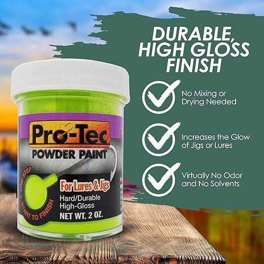 A paint that requires no primer coat and no gloss coat translates into more money in your pocket. In fact, 0.5kg. of Pro-Tec Powder Paint will cover over 3,000 of your 90ml jigs. For the manufacturer, that means paying less than 1/2 cent per jig based on the 0.5kg. price. Combine that with a painting process that takes less than 20 minutes from start to finish and youve got an unbeatable product. One coat of Pro-Tec Glow Overcoat will increase glow properties of CS Coatings Pro-Tec Standard Glow powders.