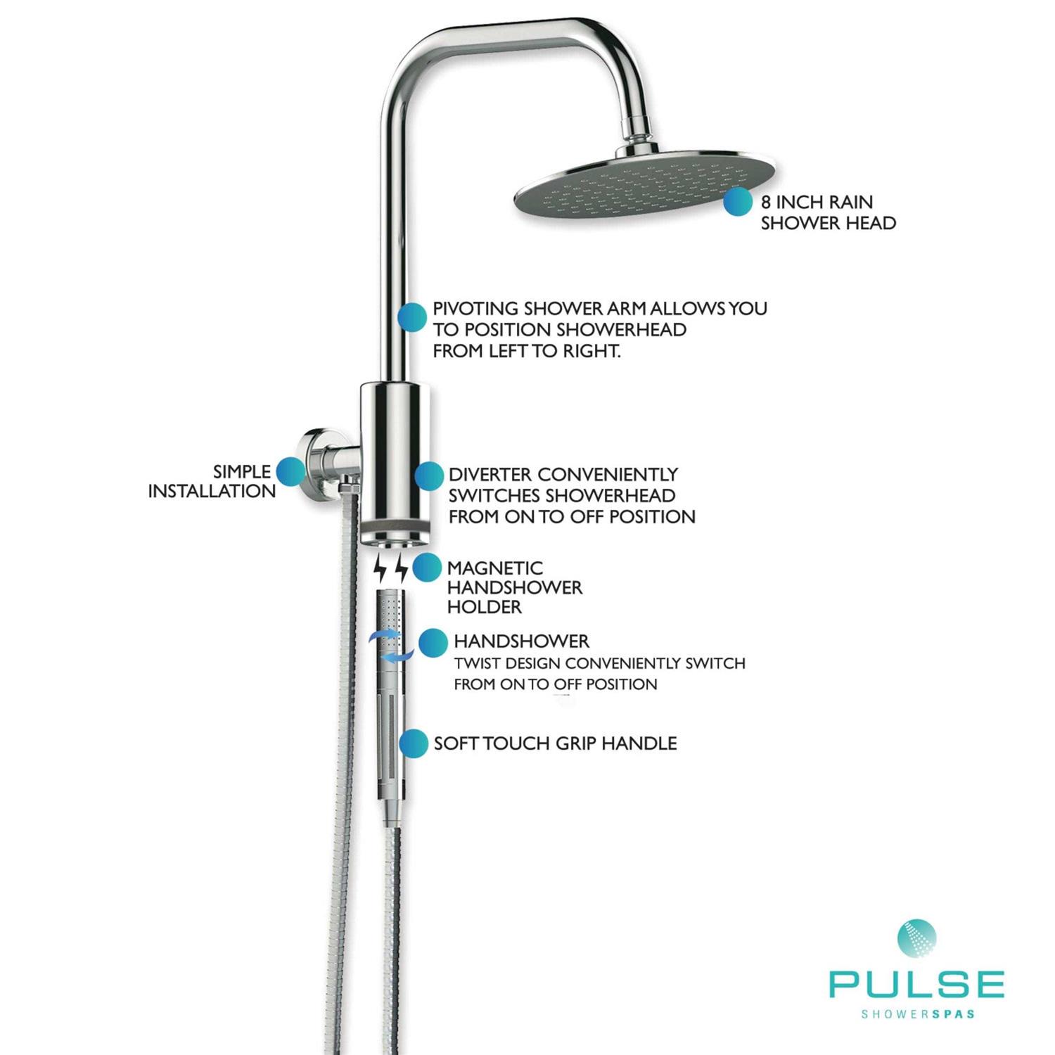 The Aquarius Shower 1052-1.8GPM System from PULSE ShowerSpas replaces your existing showerhead with an oversized rain showerhead and multi-function handshower. The integrated dual-function diverter allows you to use each function independently. Typical install is less than 1 hour—even for the do it yourselfer. It simply connects to the water supply at your existing showerhead location and uses your existing hot/cold shower valve.