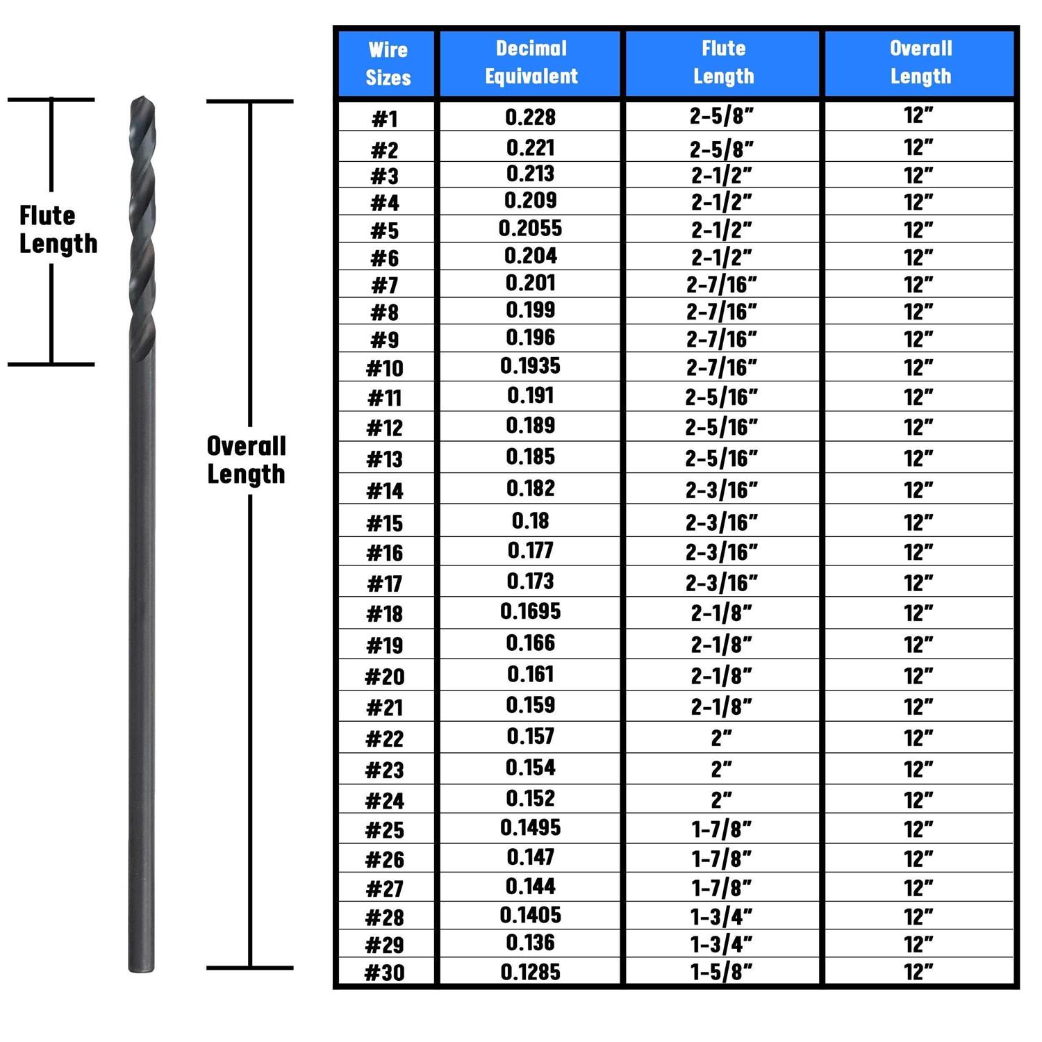 Manufactured to Aerospace Standard 907. The 135 degree split point is self-centering and reduces thrust. Ideal for drilling in mild steel where extra length for reach is required. They have a black oxide surface treatment that is abrasion resistant, reduces chip welding and improves chip flow. Sizes smaller than 1/16 and #52 have the 118 degree standard point.